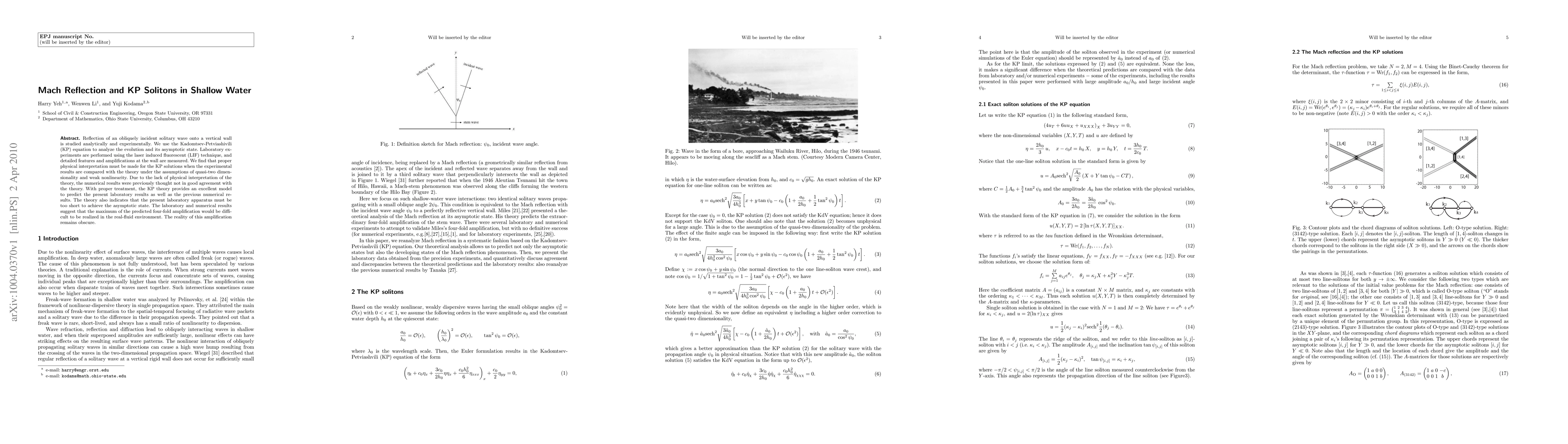 Reflection of an obliquely incident solitary wave onto a vertical wall is studied analytically and experimentally. We use the Kadomtsev-Petviashivili (KP) equation to analyze the evolution and its asymptotic state. Laboratory experiments are performed using the laser induced fluorescent (LIF) technique, and detailed features and amplifications at the wall are measured. We find that proper physical interpretation must be made for the KP solutions when the experimental results are compared with the theory under the assumptions of quasi-two dimensionality and weak nonlinearity. Due to the lack of physical interpretation of the theory, the numerical results were previously thought not in good agreement with the theory. With proper treatment, the KP theory provides an excellent model to predict the present laboratory results as well as the previous numerical results. The theory also indicates that the present laboratory apparatus must be too short to achieve the asymptotic state. The laboratory and numerical results suggest that the maximum of the predicted four-fold amplification would be difficult to be realized in the real-fluid environment. The reality of this amplification remains obscure.