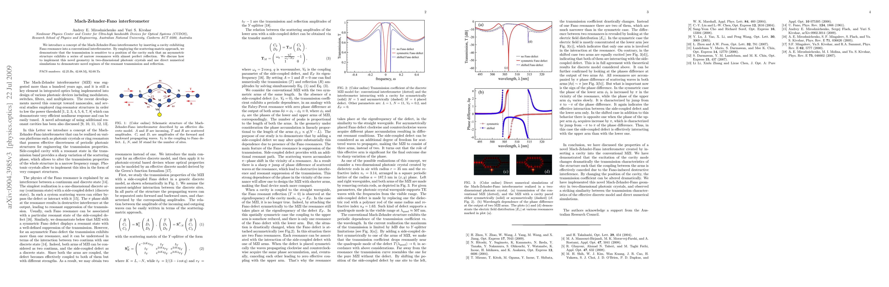 This paper introduces a novel Mach-Zehnder-Fano interferometer that incorporates a cavity with Fano resonance, showing that its transmission is highly sensitive to cavity position. The asymmetric structure results in narrow resonances with near-perfect reflection, and the concept is demonstrated via simulations in two-dimensional photonic crystals.