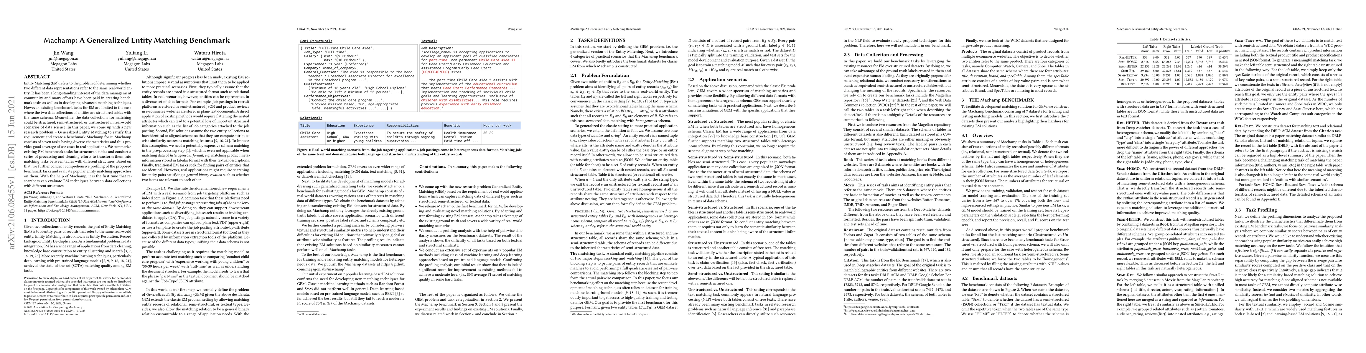 Machamp introduces a Generalized Entity Matching benchmark addressing the limitations of existing structured table-based benchmarks by encompassing diverse data collection types. It provides seven varied tasks to evaluate entity matching across different data structures, enabling comprehensive assessment of EM techniques.