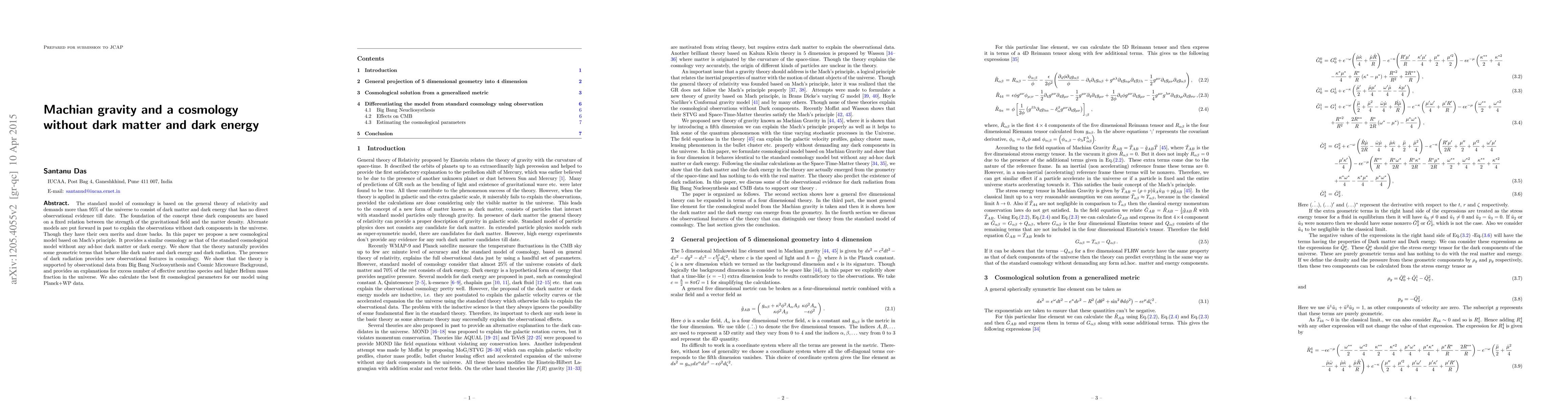 This paper proposes a new cosmological model based on Mach's principle that achieves a similar cosmology to the standard model without invoking dark matter or dark energy, instead using geometric terms that mimic their effects. The model is supported by observational data and explains phenomena like the excess number of effective neutrino species and higher Helium mass fraction.
