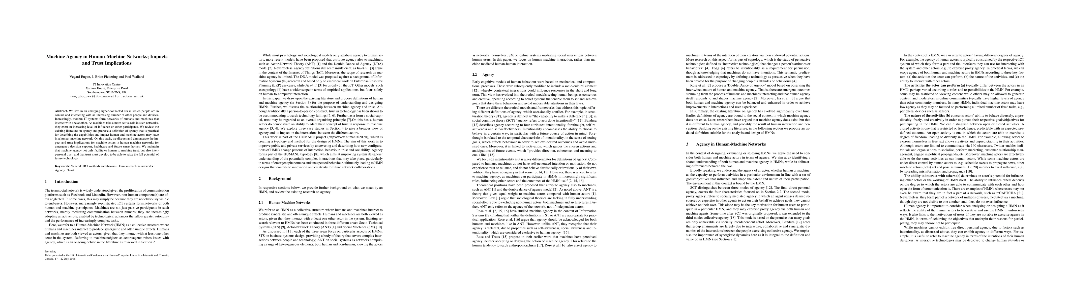 We live in an emerging hyper-connected era in which people are in contact and interacting with an increasing number of other people and devices. Increasingly, modern IT systems form networks of humans and machines that interact with one another. As machines take a more active role in such networks, they exert an in-creasing level of influence on other participants. We review the existing literature on agency and propose a definition of agency that is practical for describing the capabilities and impact human and machine actors may have in a human-machine network. On this basis, we discuss and demonstrate the impact and trust implica-tions for machine actors in human-machine networks for emergency decision support, healthcare and future smart homes. We maintain that machine agency not only facilitates human to machine trust, but also interpersonal trust; and that trust must develop to be able to seize the full potential of future technology.