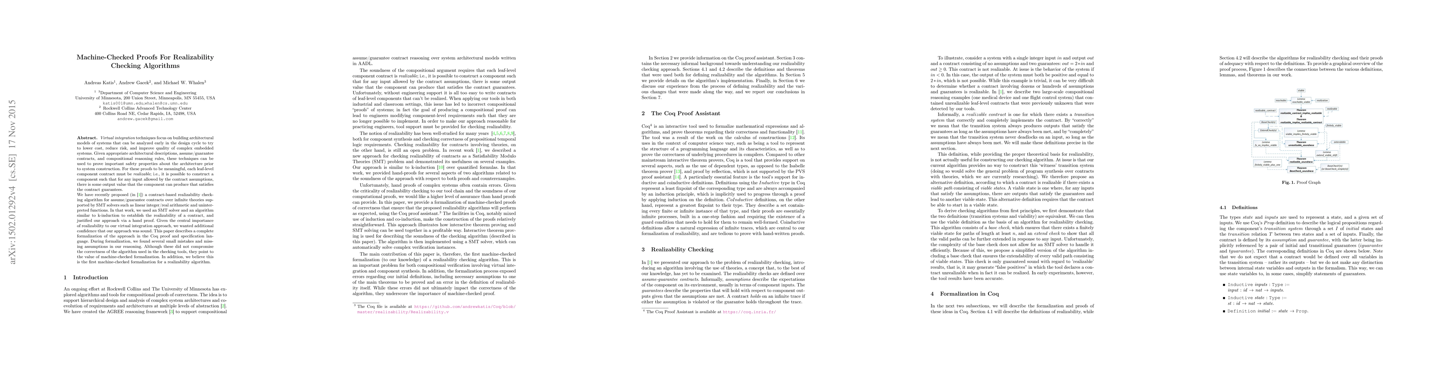Virtual integration techniques focus on building architectural models of systems that can be analyzed early in the design cycle to try to lower cost, reduce risk, and improve quality of complex embedded systems. Given appropriate architectural descriptions, assume/guarantee contracts, and compositional reasoning rules, these techniques can be used to prove important safety properties about the architecture prior to system construction. For these proofs to be meaningful, each leaf-level component contract must be realizable; i.e., it is possible to construct a component such that for any input allowed by the contract assumptions, there is some output value that the component can produce that satisfies the contract guarantees. We have recently proposed (in [1]) a contract-based realizability checking algorithm for assume/guarantee contracts over infinite theories supported by SMT solvers such as linear integer/real arithmetic and uninterpreted functions. In that work, we used an SMT solver and an algorithm similar to k-induction to establish the realizability of a contract, and justified our approach via a hand proof. Given the central importance of realizability to our virtual integration approach, we wanted additional confidence that our approach was sound. This paper describes a complete formalization of the approach in the Coq proof and specification language. During formalization, we found several small mistakes and missing assumptions in our reasoning. Although these did not compromise the correctness of the algorithm used in the checking tools, they point to the value of machine-checked formalization. In addition, we believe this is the first machine-checked formalization for a realizability algorithm.