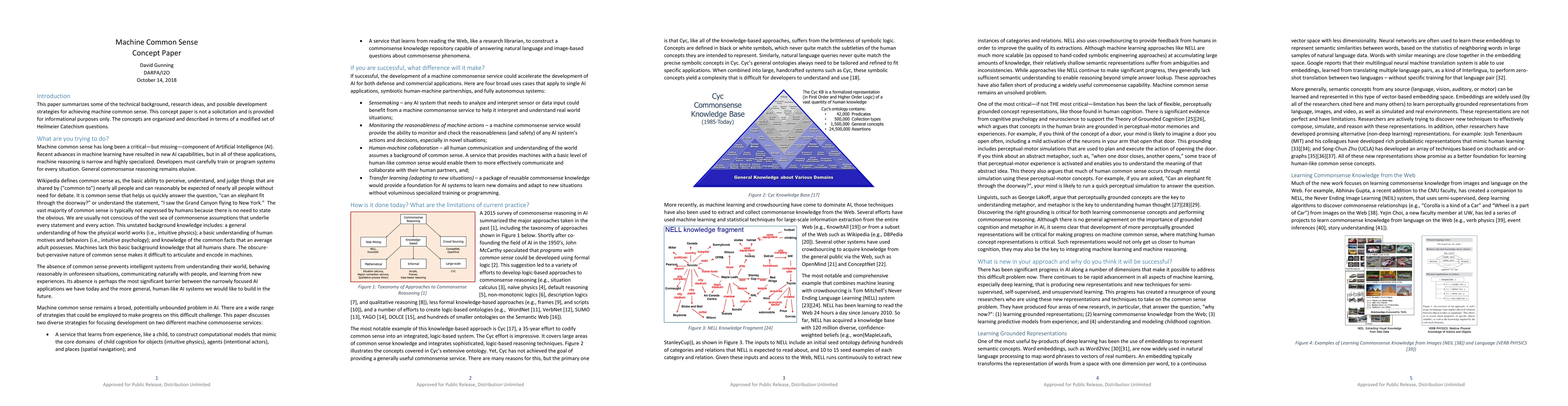This paper explores the concept of machine common sense as a critical yet missing component in AI, emphasizing the need for general reasoning capabilities. It proposes two strategies: one focusing on learning from experience to mimic child cognition, and another on constructing a knowledge repository from web data to answer commonsense questions.