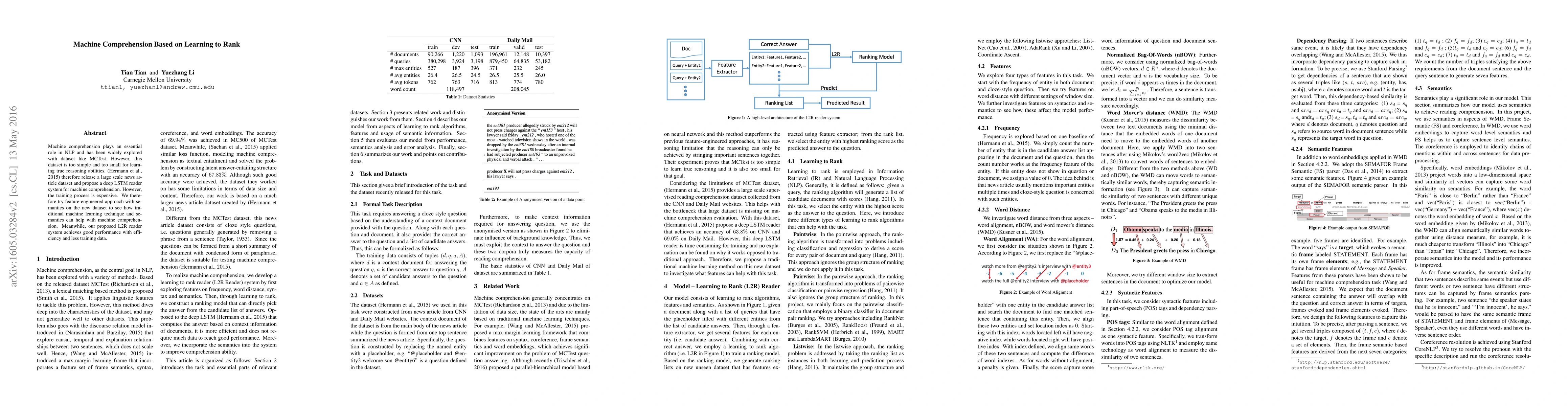 Machine comprehension plays an essential role in NLP and has been widely explored with dataset like MCTest. However, this dataset is too simple and too small for learning true reasoning abilities. \cite{hermann2015teaching} therefore release a large scale news article dataset and propose a deep LSTM reader system for machine comprehension. However, the training process is expensive. We therefore try feature-engineered approach with semantics on the new dataset to see how traditional machine learning technique and semantics can help with machine comprehension. Meanwhile, our proposed L2R reader system achieves good performance with efficiency and less training data.