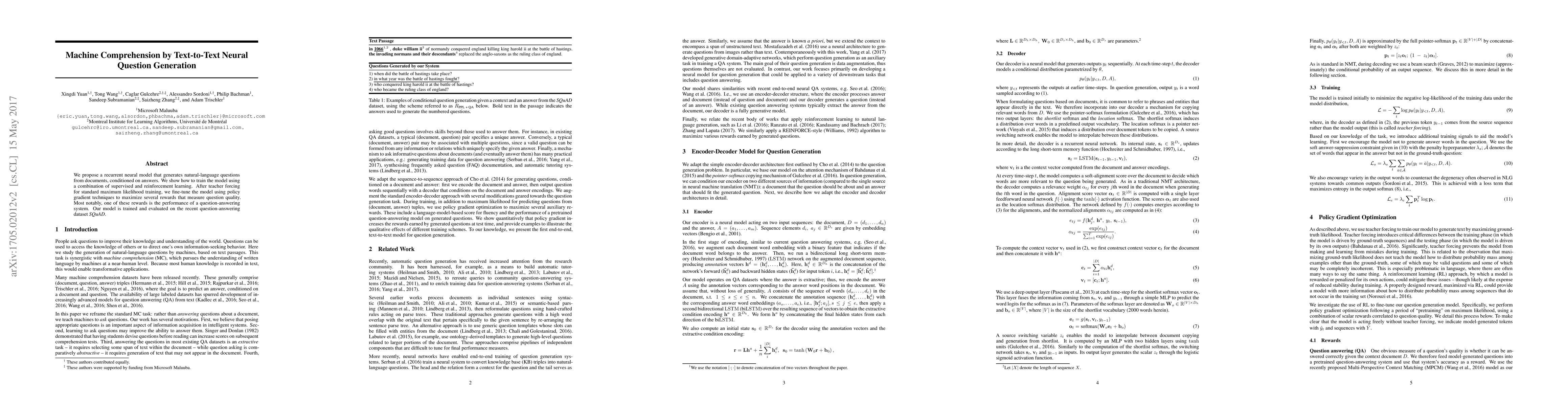 This paper introduces a recurrent neural model that generates natural-language questions from documents, aiming to enhance question-answering performance. The model is trained via supervised learning and fine-tuned using reinforcement learning to maximize question quality and question-answering system performance, evaluated on the SQuAD dataset.