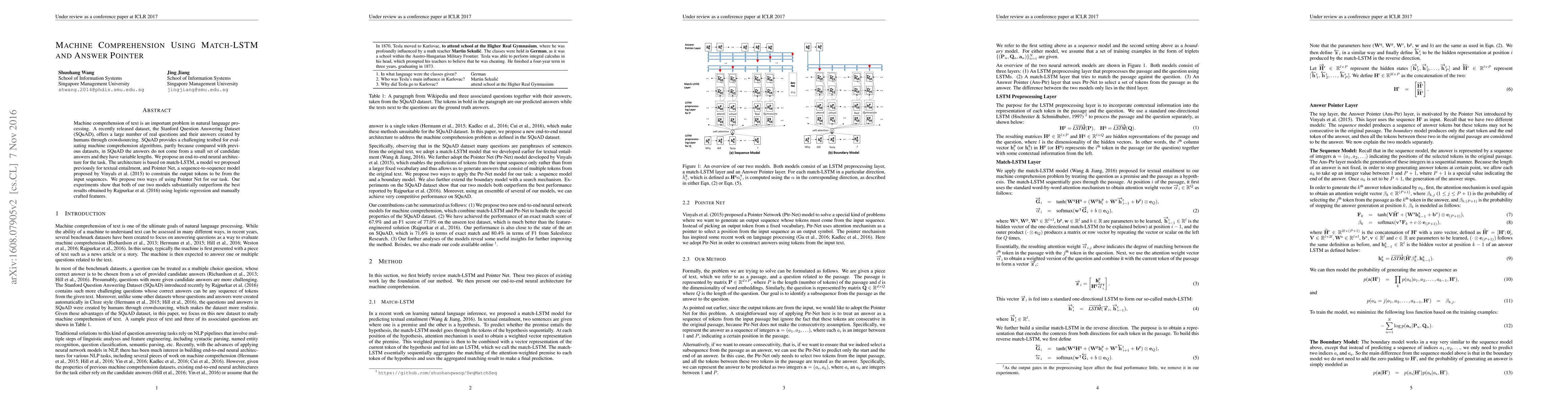 This paper proposes an end-to-end neural architecture combining match-LSTM and Pointer Net for machine comprehension on the SQuAD dataset. The proposed models outperform previous results using logistic regression and handcrafted features.