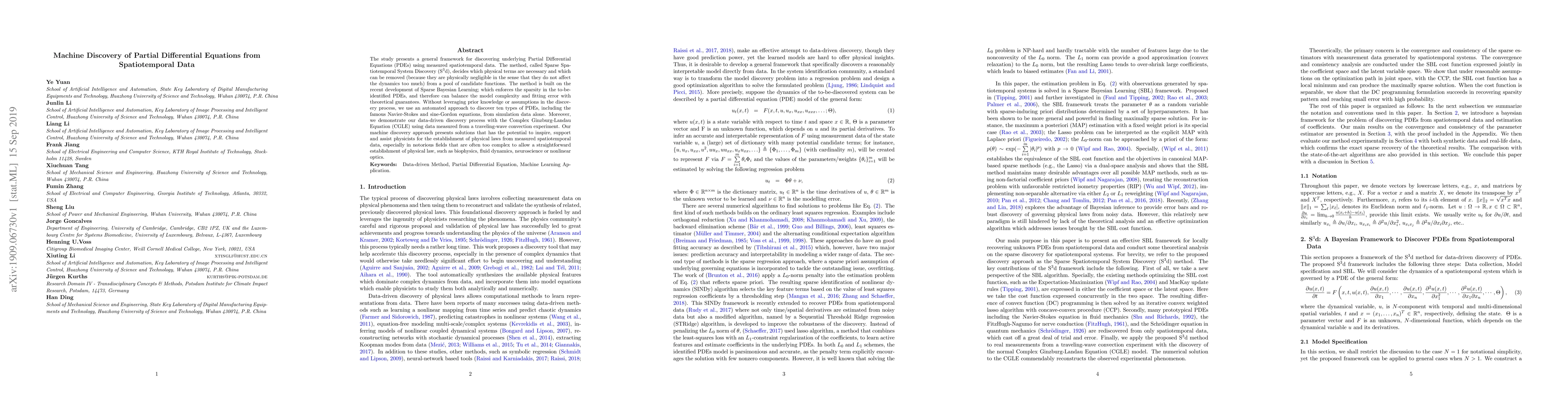 The study presents a general framework for discovering underlying Partial Differential Equations (PDEs) using measured spatiotemporal data. The method, called Sparse Spatiotemporal System Discovery ($\text{S}^3\text{d}$), decides which physical terms are necessary and which can be removed (because they are physically negligible in the sense that they do not affect the dynamics too much) from a pool of candidate functions. The method is built on the recent development of Sparse Bayesian Learning; which enforces the sparsity in the to-be-identified PDEs, and therefore can balance the model complexity and fitting error with theoretical guarantees. Without leveraging prior knowledge or assumptions in the discovery process, we use an automated approach to discover ten types of PDEs, including the famous Navier-Stokes and sine-Gordon equations, from simulation data alone. Moreover, we demonstrate our data-driven discovery process with the Complex Ginzburg-Landau Equation (CGLE) using data measured from a traveling-wave convection experiment. Our machine discovery approach presents solutions that has the potential to inspire, support and assist physicists for the establishment of physical laws from measured spatiotemporal data, especially in notorious fields that are often too complex to allow a straightforward establishment of physical law, such as biophysics, fluid dynamics, neuroscience or nonlinear optics.