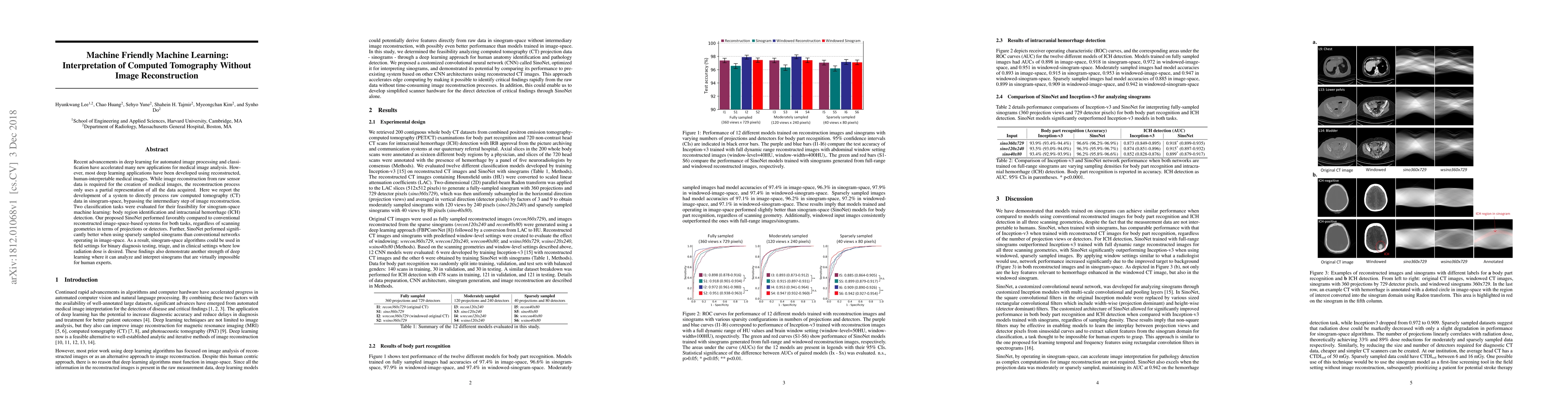 Recent advancements in deep learning for automated image processing and classification have accelerated many new applications for medical image analysis. However, most deep learning applications have been developed using reconstructed, human-interpretable medical images. While image reconstruction from raw sensor data is required for the creation of medical images, the reconstruction process only uses a partial representation of all the data acquired. Here we report the development of a system to directly process raw computed tomography (CT) data in sinogram-space, bypassing the intermediary step of image reconstruction. Two classification tasks were evaluated for their feasibility for sinogram-space machine learning: body region identification and intracranial hemorrhage (ICH) detection. Our proposed SinoNet performed favorably compared to conventional reconstructed image-space-based systems for both tasks, regardless of scanning geometries in terms of projections or detectors. Further, SinoNet performed significantly better when using sparsely sampled sinograms than conventional networks operating in image-space. As a result, sinogram-space algorithms could be used in field settings for binary diagnosis testing, triage, and in clinical settings where low radiation dose is desired. These findings also demonstrate another strength of deep learning where it can analyze and interpret sinograms that are virtually impossible for human experts.