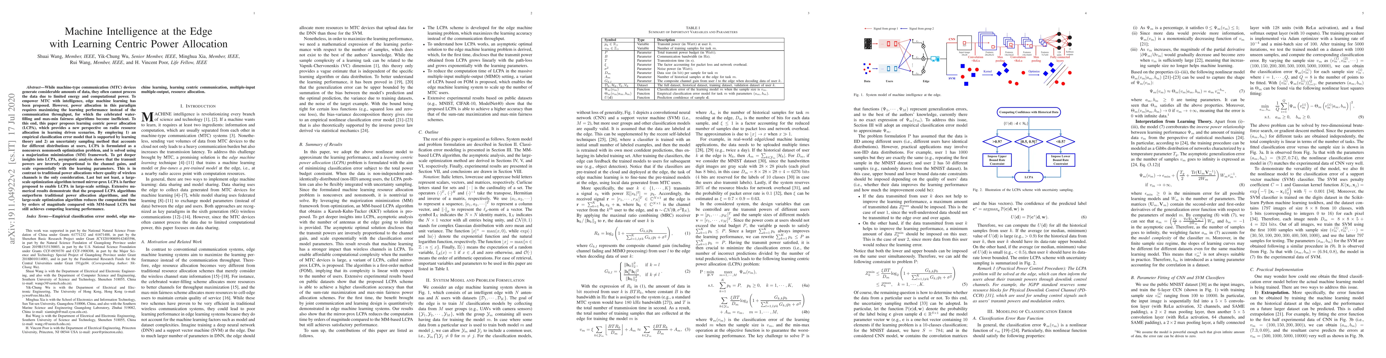 While machine-type communication (MTC) devices generate considerable amounts of data, they often cannot process the data due to limited energy and computational power. To empower MTC with intelligence, edge machine learning has been proposed. However, power allocation in this paradigm requires maximizing the learning performance instead of the communication throughput, for which the celebrated water-filling and max-min fairness algorithms become inefficient. To this end, this paper proposes learning centric power allocation (LCPA), which provides a new perspective on radio resource allocation in learning driven scenarios. By employing 1) an empirical classification error model that is supported by learning theory and 2) an uncertainty sampling method that accounts for different distributions at users, LCPA is formulated as a nonconvex nonsmooth optimization problem, and is solved using a majorization minimization (MM) framework. To get deeper insights into LCPA, asymptotic analysis shows that the transmit powers are inversely proportional to the channel gains, and scale exponentially with the learning parameters. This is in contrast to traditional power allocations where quality of wireless channels is the only consideration. Last but not least, a large-scale optimization algorithm termed mirror-prox LCPA is further proposed to enable LCPA in large-scale settings. Extensive numerical results demonstrate that the proposed LCPA algorithms outperform traditional power allocation algorithms, and the large-scale optimization algorithm reduces the computation time by orders of magnitude compared with MM-based LCPA but still achieves competing learning performance.