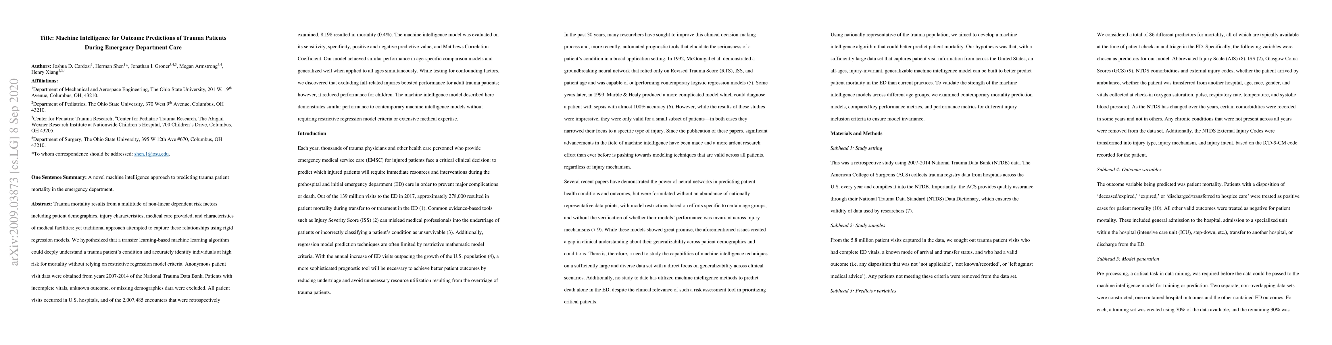 Trauma mortality results from a multitude of non-linear dependent risk factors including patient demographics, injury characteristics, medical care provided, and characteristics of medical facilities; yet traditional approach attempted to capture these relationships using rigid regression models. We hypothesized that a transfer learning based machine learning algorithm could deeply understand a trauma patient's condition and accurately identify individuals at high risk for mortality without relying on restrictive regression model criteria. Anonymous patient visit data were obtained from years 2007-2014 of the National Trauma Data Bank. Patients with incomplete vitals, unknown outcome, or missing demographics data were excluded. All patient visits occurred in U.S. hospitals, and of the 2,007,485 encounters that were retrospectively examined, 8,198 resulted in mortality (0.4%). The machine intelligence model was evaluated on its sensitivity, specificity, positive and negative predictive value, and Matthews Correlation Coefficient. Our model achieved similar performance in age-specific comparison models and generalized well when applied to all ages simultaneously. While testing for confounding factors, we discovered that excluding fall-related injuries boosted performance for adult trauma patients; however, it reduced performance for children. The machine intelligence model described here demonstrates similar performance to contemporary machine intelligence models without requiring restrictive regression model criteria or extensive medical expertise.