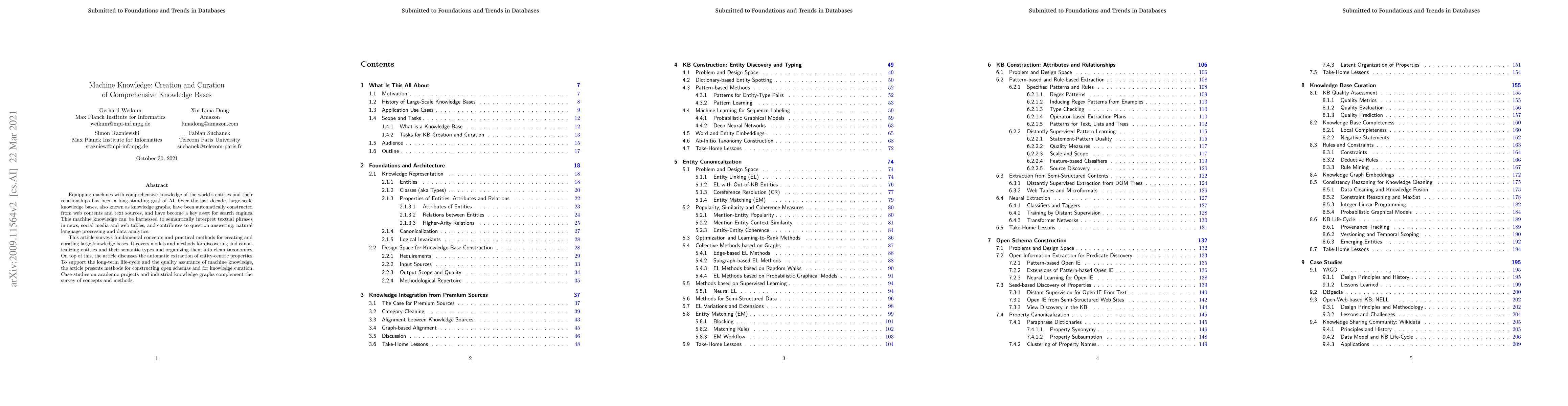 Equipping machines with comprehensive knowledge of the world's entities and their relationships has been a long-standing goal of AI. Over the last decade, large-scale knowledge bases, also known as knowledge graphs, have been automatically constructed from web contents and text sources, and have become a key asset for search engines. This machine knowledge can be harnessed to semantically interpret textual phrases in news, social media and web tables, and contributes to question answering, natural language processing and data analytics. This article surveys fundamental concepts and practical methods for creating and curating large knowledge bases. It covers models and methods for discovering and canonicalizing entities and their semantic types and organizing them into clean taxonomies. On top of this, the article discusses the automatic extraction of entity-centric properties. To support the long-term life-cycle and the quality assurance of machine knowledge, the article presents methods for constructing open schemas and for knowledge curation. Case studies on academic projects and industrial knowledge graphs complement the survey of concepts and methods.