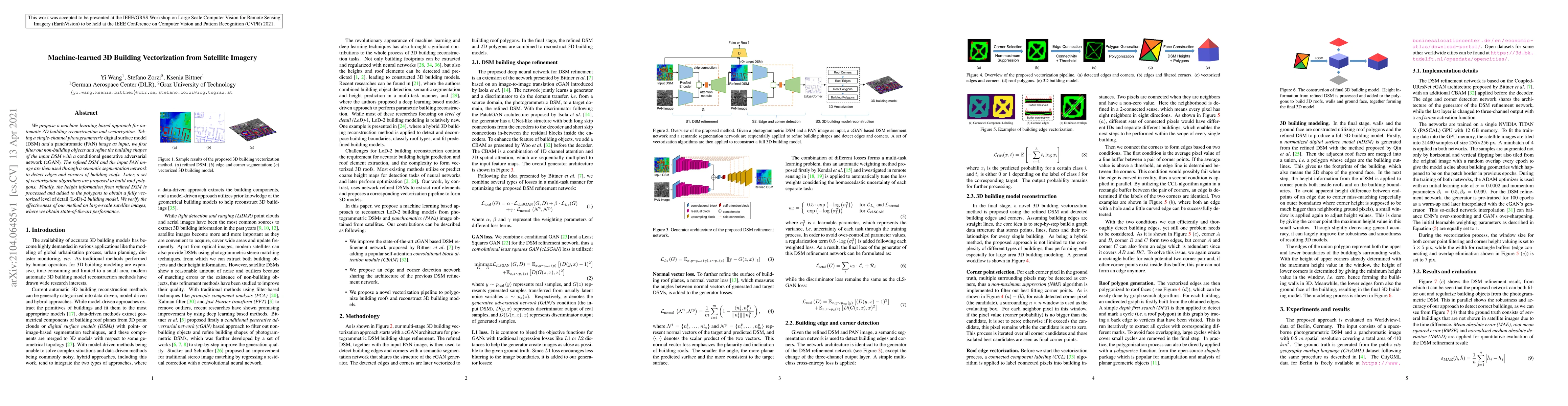 We propose a machine learning based approach for automatic 3D building reconstruction and vectorization. Taking a single-channel photogrammetric digital surface model (DSM) and panchromatic (PAN) image as input, we first filter out non-building objects and refine the building shapes of input DSM with a conditional generative adversarial network (cGAN). The refined DSM and the input PAN image are then used through a semantic segmentation network to detect edges and corners of building roofs. Later, a set of vectorization algorithms are proposed to build roof polygons. Finally, the height information from the refined DSM is added to the polygons to obtain a fully vectorized level of detail (LoD)-2 building model. We verify the effectiveness of our method on large-scale satellite images, where we obtain state-of-the-art performance.