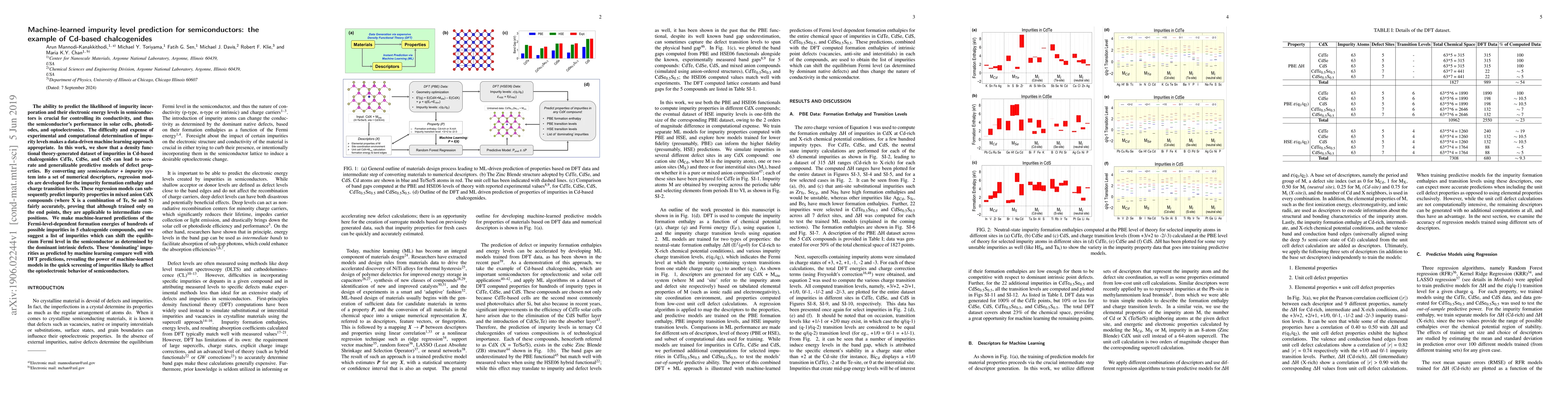 This paper develops machine learning models to predict impurity incorporation and electronic energy levels in Cd-based chalcogenides, using density functional theory data. The predictive models accurately forecast impurity properties in mixed anion compounds, demonstrating their applicability and efficiency in screening impurities affecting semiconductor optoelectronic performance.