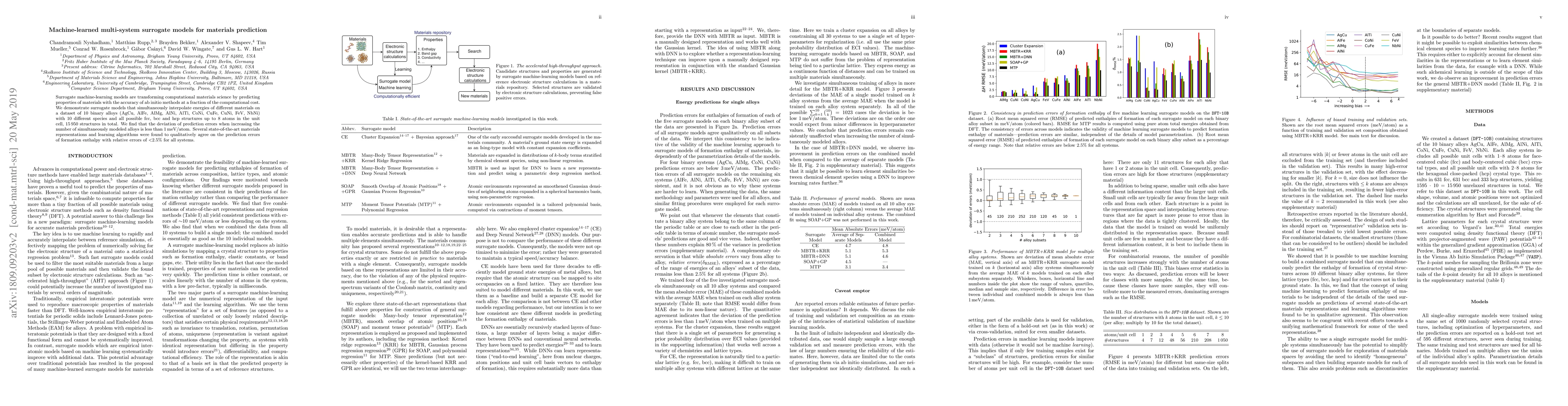 This paper develops machine-learning surrogate models to predict material properties efficiently, demonstrating their accuracy across 10 binary alloys with various crystal structures. The models show minimal prediction error increase when modeling multiple alloys, achieving relative errors of less than 2.5% for formation enthalpy.