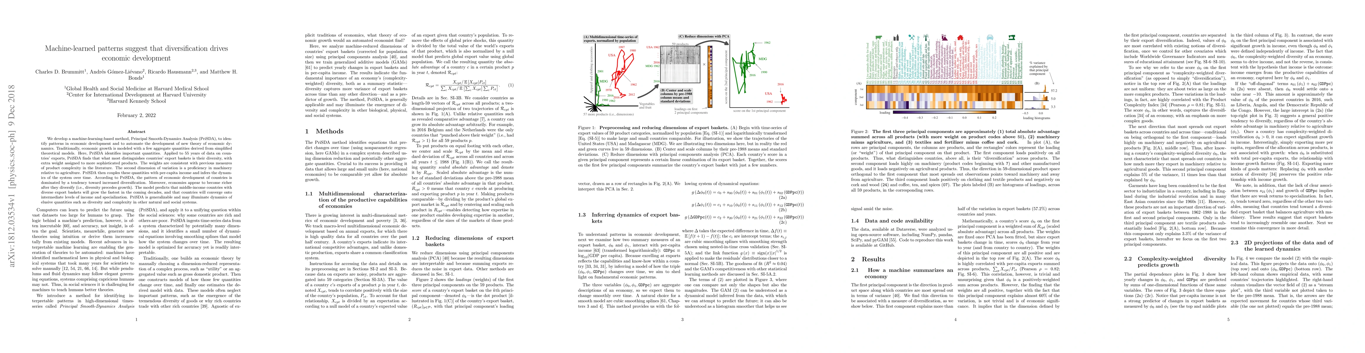 We develop a machine-learning-based method, Principal Smooth-Dynamics Analysis (PriSDA), to identify patterns in economic development and to automate the development of new theory of economic dynamics. Traditionally, economic growth is modeled with a few aggregate quantities derived from simplified theoretical models. Here, PriSDA identifies important quantities. Applied to 55 years of data on countries' exports, PriSDA finds that what most distinguishes countries' export baskets is their diversity, with extra weight assigned to more sophisticated products. The weights are consistent with previous measures of product complexity in the literature. The second dimension of variation is a proficiency in machinery relative to agriculture. PriSDA then couples these quantities with per-capita income and infers the dynamics of the system over time. According to PriSDA, the pattern of economic development of countries is dominated by a tendency toward increased diversification. Moreover, economies appear to become richer after they diversify (i.e., diversity precedes growth). The model predicts that middle-income countries with diverse export baskets will grow the fastest in the coming decades, and that countries will converge onto intermediate levels of income and specialization. PriSDA is generalizable and may illuminate dynamics of elusive quantities such as diversity and complexity in other natural and social systems.