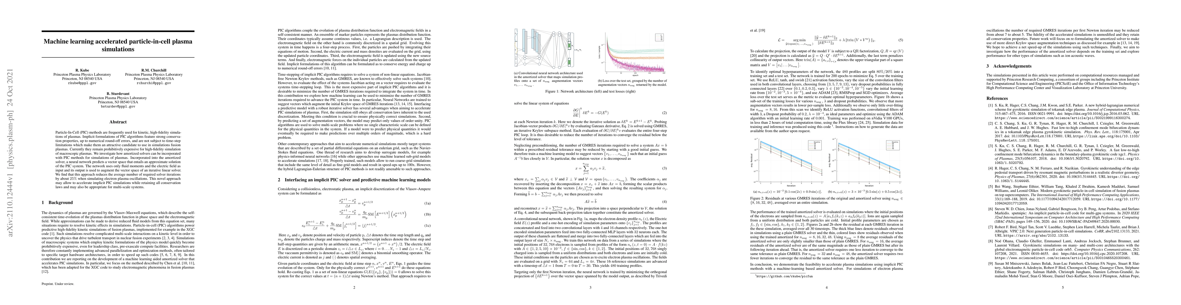 This paper explores the integration of machine learning with Particle-In-Cell (PIC) methods to accelerate simulations of plasmas, using a neural network to predict solutions that augment an iterative linear solver, achieving a 25% reduction in solver iterations while maintaining conservation properties.