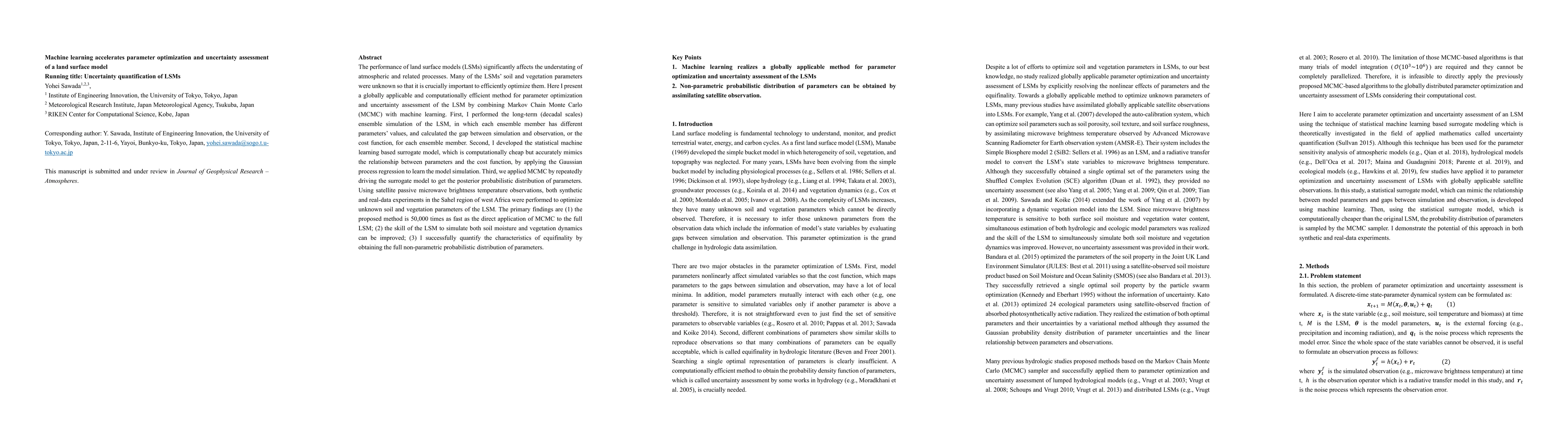 The performance of land surface models (LSMs) significantly affects the understanding of atmospheric and related processes. Many of the LSMs' soil and vegetation parameters were unknown so that it is crucially important to efficiently optimize them. Here I present a globally applicable and computationally efficient method for parameter optimization and uncertainty assessment of the LSM by combining Markov Chain Monte Carlo (MCMC) with machine learning. First, I performed the long-term (decadal scales) ensemble simulation of the LSM, in which each ensemble member has different parameters' values, and calculated the gap between simulation and observation, or the cost function, for each ensemble member. Second, I developed the statistical machine learning based surrogate model, which is computationally cheap but accurately mimics the relationship between parameters and the cost function, by applying the Gaussian process regression to learn the model simulation. Third, we applied MCMC by repeatedly driving the surrogate model to get the posterior probabilistic distribution of parameters. Using satellite passive microwave brightness temperature observations, both synthetic and real-data experiments in the Sahel region of west Africa were performed to optimize unknown soil and vegetation parameters of the LSM. The primary findings are (1) the proposed method is 50,000 times as fast as the direct application of MCMC to the full LSM; (2) the skill of the LSM to simulate both soil moisture and vegetation dynamics can be improved; (3) I successfully quantify the characteristics of equifinality by obtaining the full non-parametric probabilistic distribution of parameters.