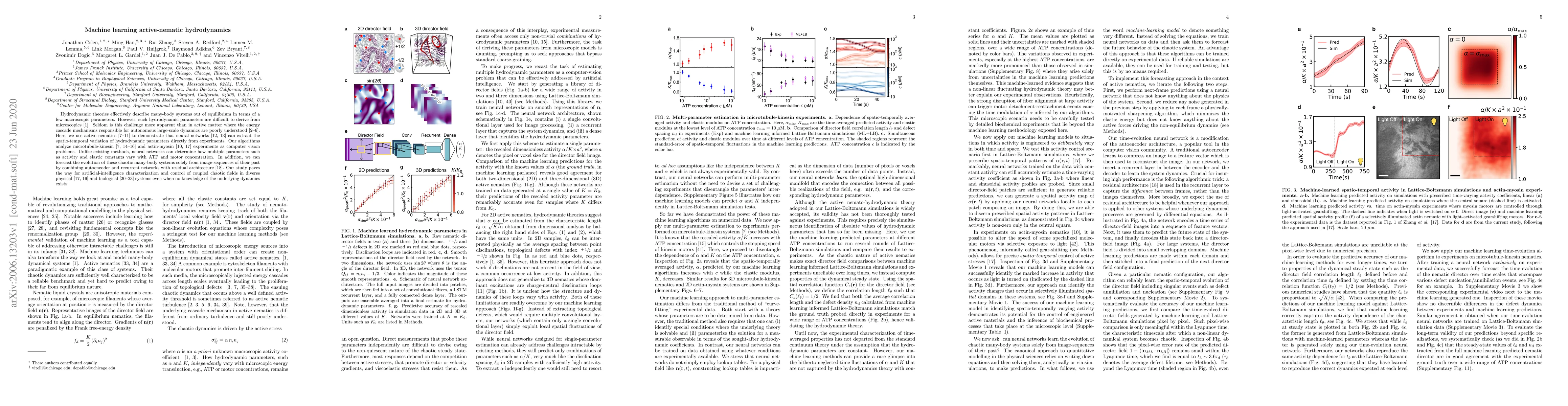 Hydrodynamic theories effectively describe many-body systems out of equilibrium in terms of a few macroscopic parameters. However, such hydrodynamic parameters are difficult to derive from microscopics. Seldom is this challenge more apparent than in active matter where the energy cascade mechanisms responsible for autonomous large-scale dynamics are poorly understood. Here, we use active nematics to demonstrate that neural networks can extract the spatio-temporal variation of hydrodynamic parameters directly from experiments. Our algorithms analyze microtubule-kinesin and actin-myosin experiments as computer vision problems. Unlike existing methods, neural networks can determine how multiple parameters such as activity and elastic constants vary with ATP and motor concentration. In addition, we can forecast the evolution of these chaotic many-body systems solely from image-sequences of their past by combining autoencoder and recurrent networks with residual architecture. Our study paves the way for artificial-intelligence characterization and control of coupled chaotic fields in diverse physical and biological systems even when no knowledge of the underlying dynamics exists.