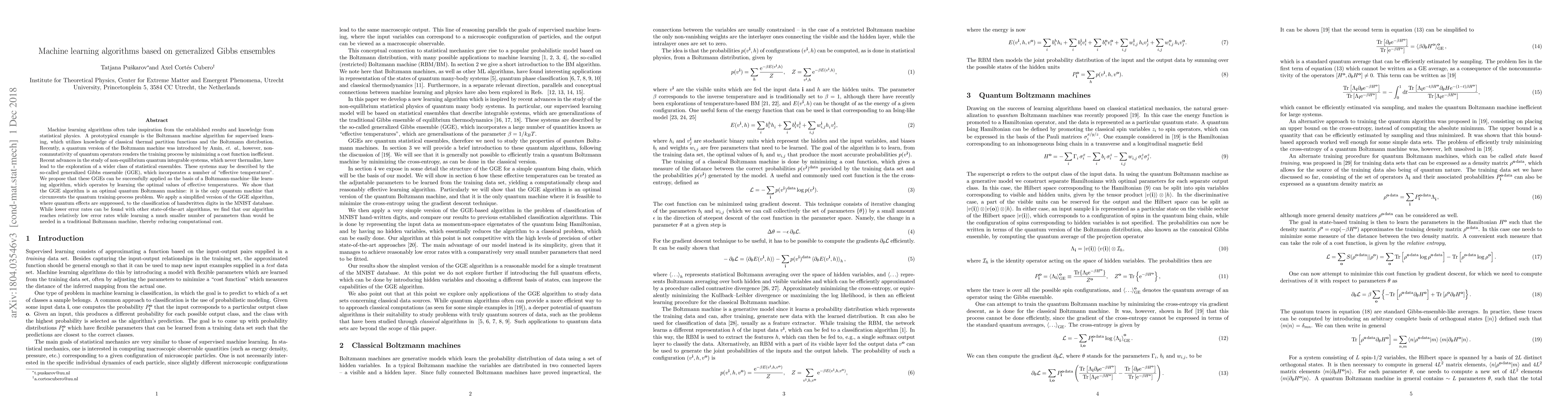Machine learning algorithms often take inspiration from established results and knowledge from statistical physics. A prototypical example is the Boltzmann machine algorithm for supervised learning, which utilizes knowledge of classical thermal partition functions and the Boltzmann distribution. Recently, a quantum version of the Boltzmann machine was introduced by Amin, et. al., however, non-commutativity of quantum operators renders the training process by minimizing a cost function inefficient. Recent advances in the study of non-equilibrium quantum integrable systems, which never thermalize, have lead to the exploration of a wider class of statistical ensembles. These systems may be described by the so-called generalized Gibbs ensemble (GGE), which incorporates a number of "effective temperatures". We propose that these GGE's can be successfully applied as the basis of a Boltzmann-machine-like learning algorithm, which operates by learning the optimal values of effective temperatures. We show that the GGE algorithm is an optimal quantum Boltzmann machine: it is the only quantum machine that circumvents the quantum training-process problem. We apply a simplified version of the GGE algorithm, where quantum effects are suppressed, to the classification of handwritten digits in the MNIST database. While lower error rates can be found with other state-of-the-art algorithms, we find that our algorithm reaches relatively low error rates while learning a much smaller number of parameters than would be needed in a traditional Boltzmann machine, thereby reducing computational cost.