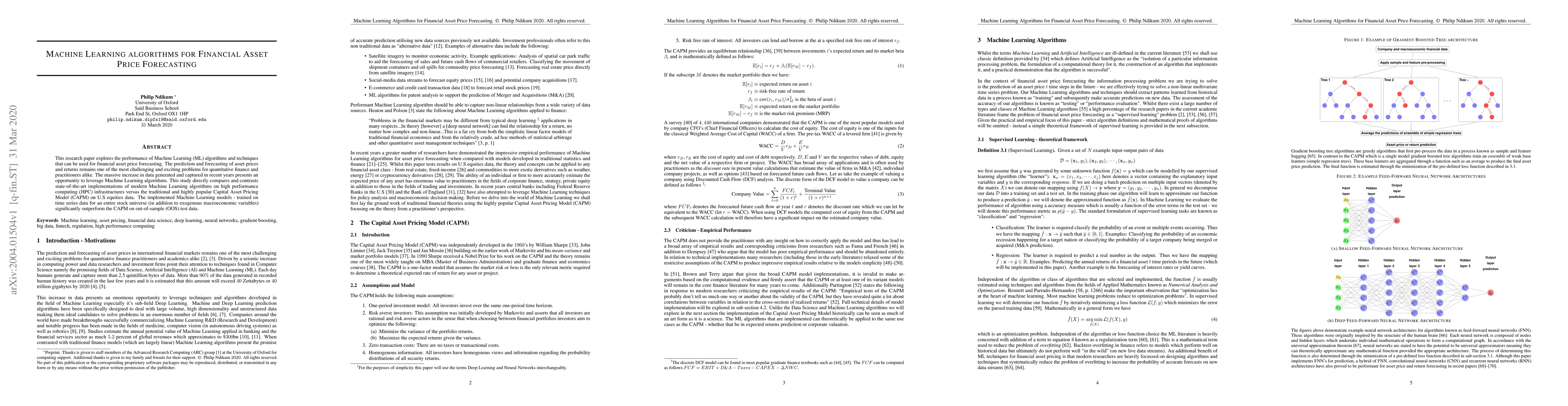 This research paper explores the performance of Machine Learning (ML) algorithms and techniques that can be used for financial asset price forecasting. The prediction and forecasting of asset prices and returns remains one of the most challenging and exciting problems for quantitative finance and practitioners alike. The massive increase in data generated and captured in recent years presents an opportunity to leverage Machine Learning algorithms. This study directly compares and contrasts state-of-the-art implementations of modern Machine Learning algorithms on high performance computing (HPC) infrastructures versus the traditional and highly popular Capital Asset Pricing Model (CAPM) on U.S equities data. The implemented Machine Learning models - trained on time series data for an entire stock universe (in addition to exogenous macroeconomic variables) significantly outperform the CAPM on out-of-sample (OOS) test data.