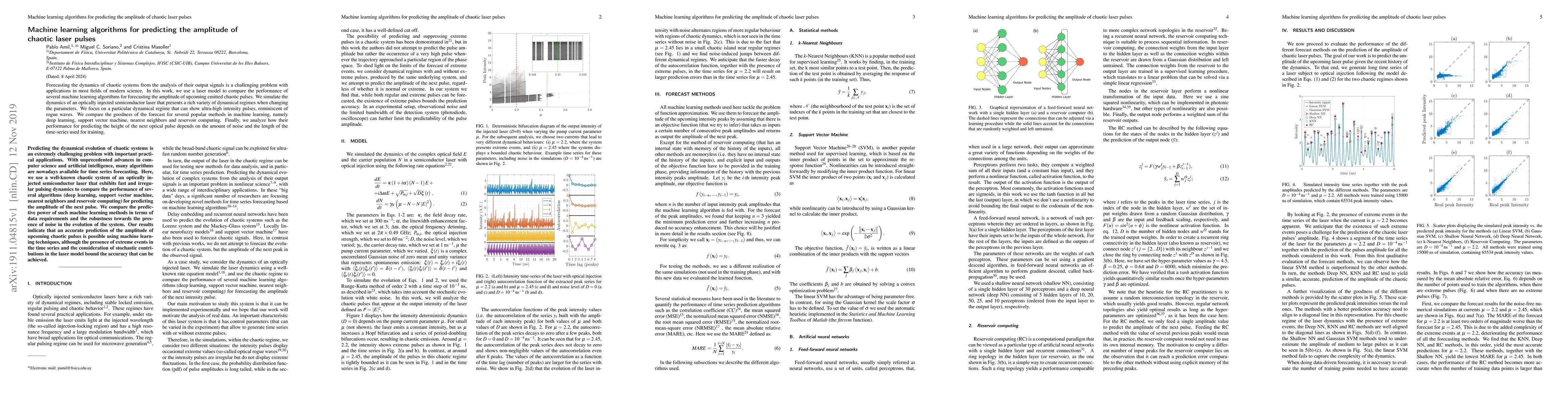 This paper compares various machine learning algorithms—deep learning, support vector machines, nearest neighbors, and reservoir computing—to predict the amplitude of chaotic laser pulses, focusing on a regime with ultra-high intensity pulses. The study analyzes the algorithms' performance under different noise levels and training time-series lengths.