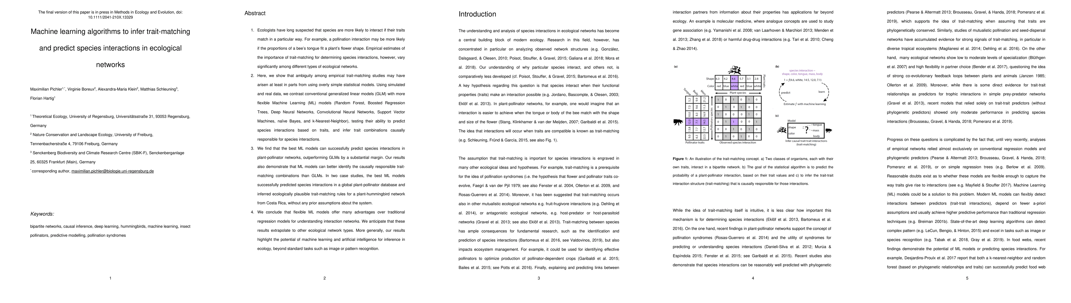 Ecologists have long suspected that species are more likely to interact if their traits match in a particular way. For example, a pollination interaction may be more likely if the proportions of a bee's tongue fit a plant's flower shape. Empirical estimates of the importance of trait-matching for determining species interactions, however, vary significantly among different types of ecological networks. Here, we show that ambiguity among empirical trait-matching studies may have arisen at least in parts from using overly simple statistical models. Using simulated and real data, we contrast conventional generalized linear models (GLM) with more flexible Machine Learning (ML) models (Random Forest, Boosted Regression Trees, Deep Neural Networks, Convolutional Neural Networks, Support Vector Machines, naive Bayes, and k-Nearest-Neighbor), testing their ability to predict species interactions based on traits, and infer trait combinations causally responsible for species interactions. We find that the best ML models can successfully predict species interactions in plant-pollinator networks, outperforming GLMs by a substantial margin. Our results also demonstrate that ML models can better identify the causally responsible trait-matching combinations than GLMs. In two case studies, the best ML models successfully predicted species interactions in a global plant-pollinator database and inferred ecologically plausible trait-matching rules for a plant-hummingbird network, without any prior assumptions. We conclude that flexible ML models offer many advantages over traditional regression models for understanding interaction networks. We anticipate that these results extrapolate to other ecological network types. More generally, our results highlight the potential of machine learning and artificial intelligence for inference in ecology, beyond standard tasks such as image or pattern recognition.