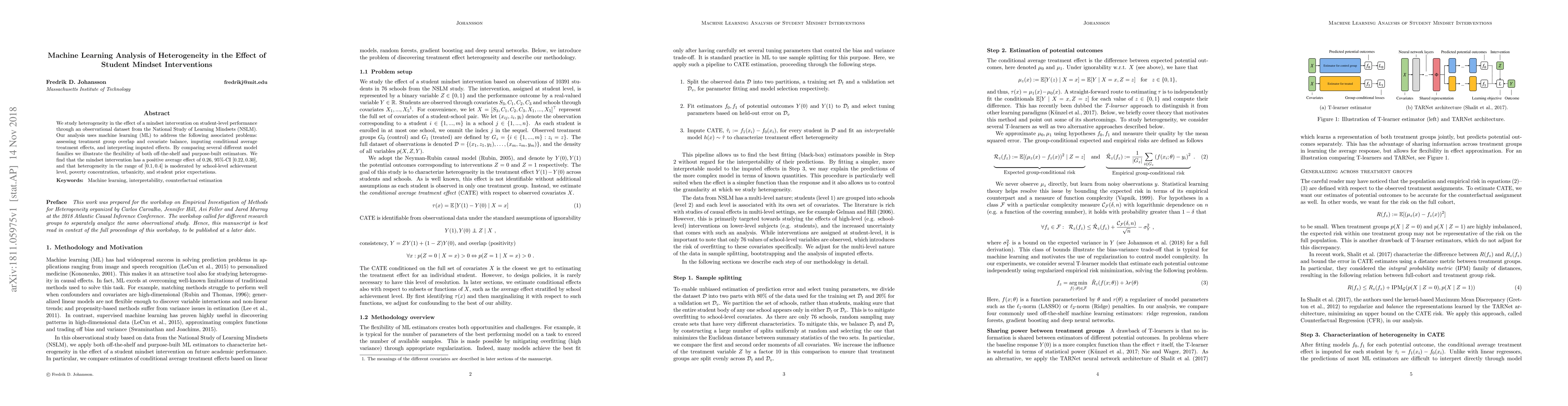 We study heterogeneity in the effect of a mindset intervention on student-level performance through an observational dataset from the National Study of Learning Mindsets (NSLM). Our analysis uses machine learning (ML) to address the following associated problems: assessing treatment group overlap and covariate balance, imputing conditional average treatment effects, and interpreting imputed effects. By comparing several different model families we illustrate the flexibility of both off-the-shelf and purpose-built estimators. We find that the mindset intervention has a positive average effect of 0.26, 95%-CI [0.22, 0.30], and that heterogeneity in the range of [0.1, 0.4] is moderated by school-level achievement level, poverty concentration, urbanicity, and student prior expectations.