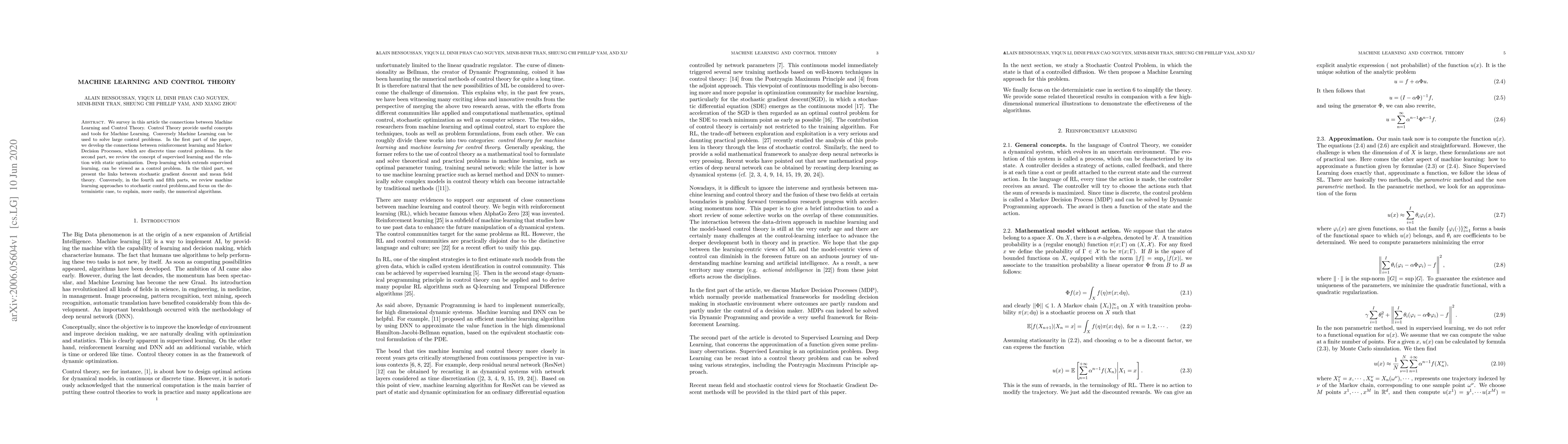 We survey in this article the connections between Machine Learning and Control Theory. Control Theory provide useful concepts and tools for Machine Learning. Conversely Machine Learning can be used to solve large control problems. In the first part of the paper, we develop the connections between reinforcement learning and Markov Decision Processes, which are discrete time control problems. In the second part, we review the concept of supervised learning and the relation with static optimization. Deep learning which extends supervised learning, can be viewed as a control problem. In the third part, we present the links between stochastic gradient descent and mean-field theory. Conversely, in the fourth and fifth parts, we review machine learning approaches to stochastic control problems, and focus on the deterministic case, to explain, more easily, the numerical algorithms.
