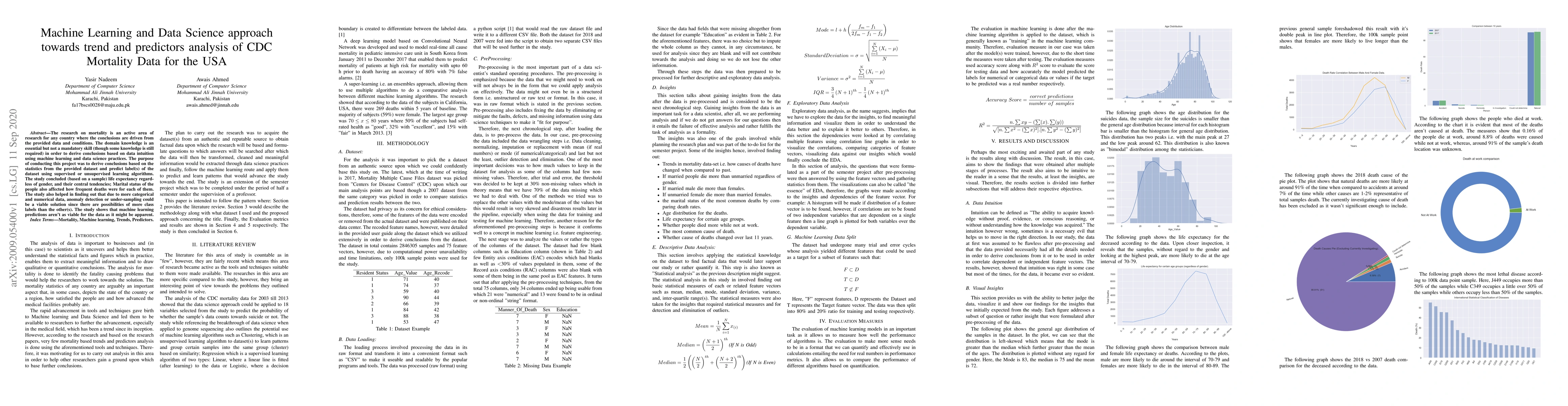 The research on mortality is an active area of research for any country where the conclusions are driven from the provided data and conditions. The domain knowledge is an essential but not a mandatory skill (though some knowledge is still required) in order to derive conclusions based on data intuition using machine learning and data science practices. The purpose of conducting this project was to derive conclusions based on the statistics from the provided dataset and predict label(s) of the dataset using supervised or unsupervised learning algorithms. The study concluded (based on a sample) life expectancy regardless of gender, and their central tendencies; Marital status of the people also affected how frequent deaths were for each of them. The study also helped in finding out that due to more categorical and numerical data, anomaly detection or under-sampling could be a viable solution since there are possibilities of more class labels than the other(s). The study shows that machine learning predictions aren't as viable for the data as it might be apparent.