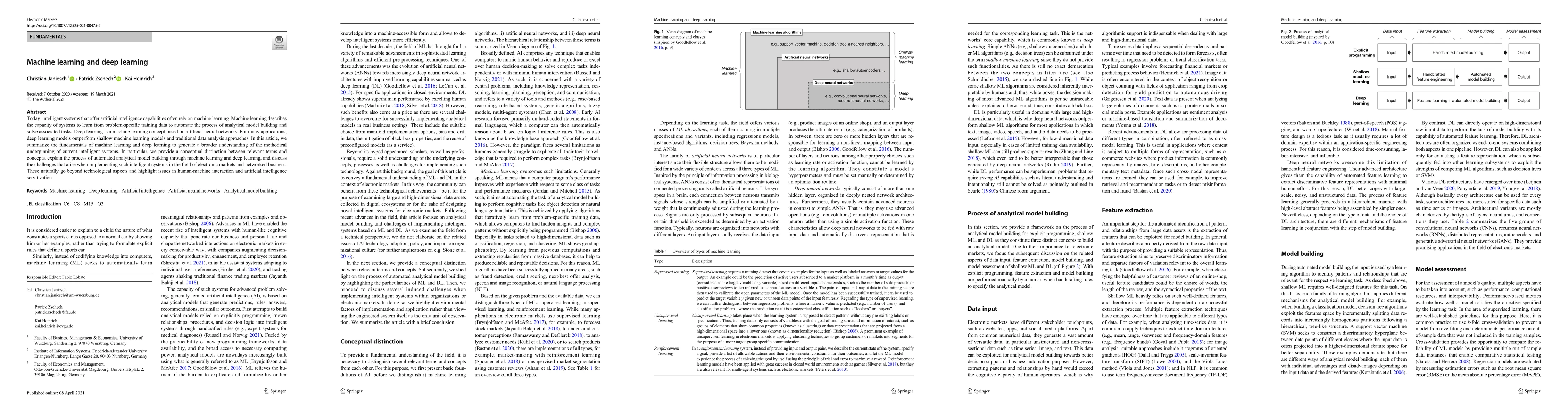 Today, intelligent systems that offer artificial intelligence capabilities often rely on machine learning. Machine learning describes the capacity of systems to learn from problem-specific training data to automate the process of analytical model building and solve associated tasks. Deep learning is a machine learning concept based on artificial neural networks. For many applications, deep learning models outperform shallow machine learning models and traditional data analysis approaches. In this article, we summarize the fundamentals of machine learning and deep learning to generate a broader understanding of the methodical underpinning of current intelligent systems. In particular, we provide a conceptual distinction between relevant terms and concepts, explain the process of automated analytical model building through machine learning and deep learning, and discuss the challenges that arise when implementing such intelligent systems in the field of electronic markets and networked business. These naturally go beyond technological aspects and highlight issues in human-machine interaction and artificial intelligence servitization.