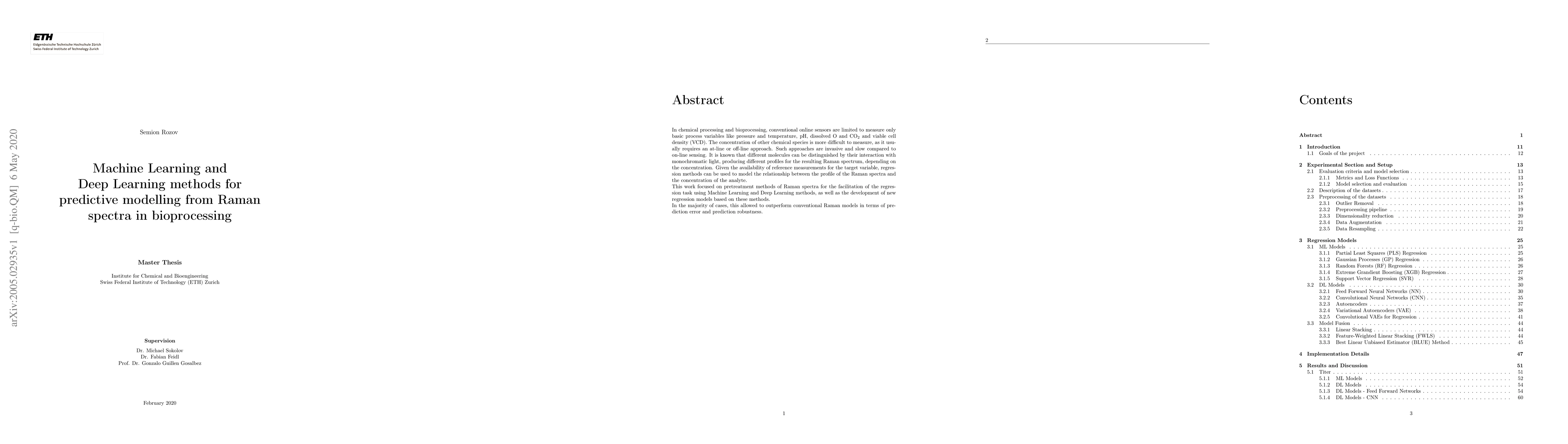 This research explores the use of Machine Learning and Deep Learning techniques to enhance predictive modeling from Raman spectra in bioprocessing. By applying various pretreatment methods, these advanced methods outperform traditional Raman models in predicting chemical species concentrations, offering a non-invasive, real-time alternative to conventional at-line or off-line measurement methods.
