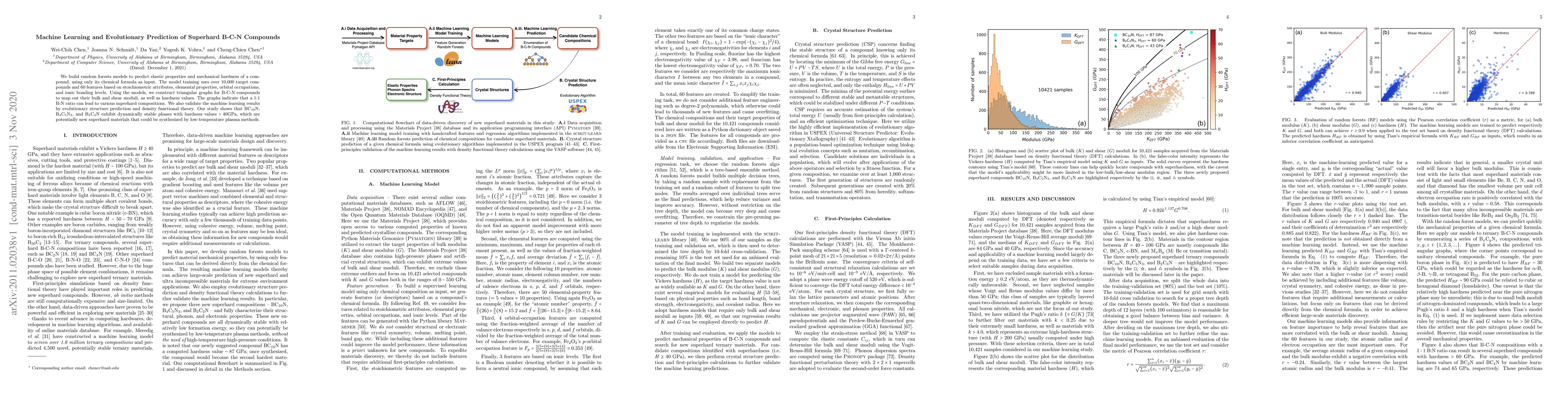 We build random forests models to predict elastic properties and mechanical hardness of a compound, using only its chemical formula as input. The model training uses over 10,000 target compounds and 60 features based on stoichiometric attributes, elemental properties, orbital occupations, and ionic bonding levels. Using the models, we construct triangular graphs for B-C-N compounds to map out their bulk and shear moduli, as well as hardness values. The graphs indicate that a 1:1 B-N ratio can lead to various superhard compositions. We also validate the machine learning results by evolutionary structure prediction and density functional theory. Our study shows that BC$_{10}$N, B$_4$C$_5$N$_3$, and B$_2$C$_3$N exhibit dynamically stable phases with hardness values $>40$GPa, which are potentially new superhard materials that could be synthesized by low-temperature plasma methods.