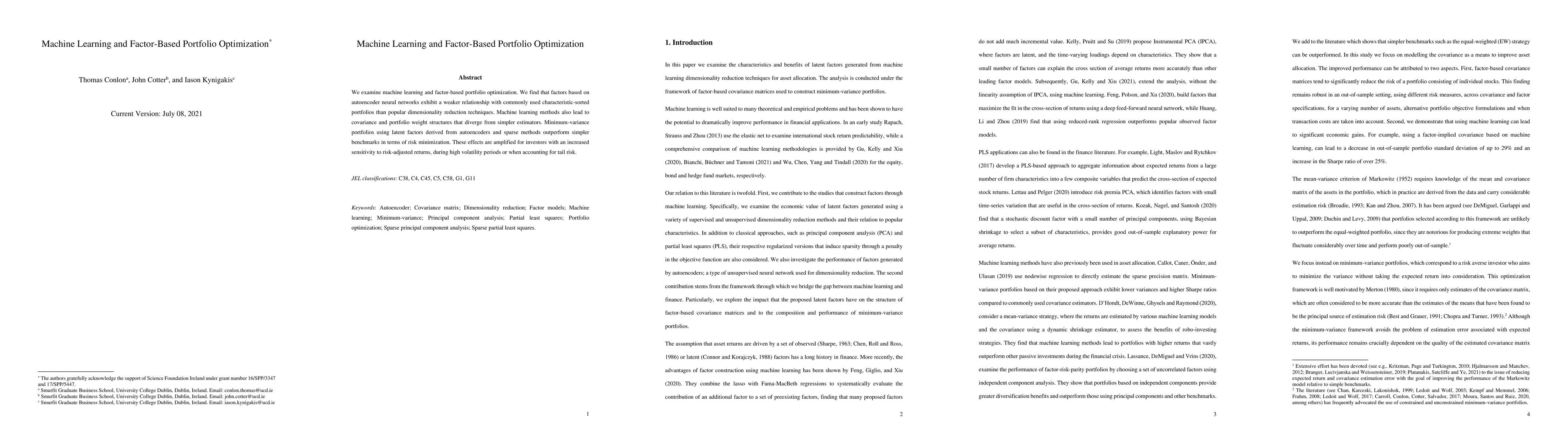 We examine machine learning and factor-based portfolio optimization. We find that factors based on autoencoder neural networks exhibit a weaker relationship with commonly used characteristic-sorted portfolios than popular dimensionality reduction techniques. Machine learning methods also lead to covariance and portfolio weight structures that diverge from simpler estimators. Minimum-variance portfolios using latent factors derived from autoencoders and sparse methods outperform simpler benchmarks in terms of risk minimization. These effects are amplified for investors with an increased sensitivity to risk-adjusted returns, during high volatility periods or when accounting for tail risk.