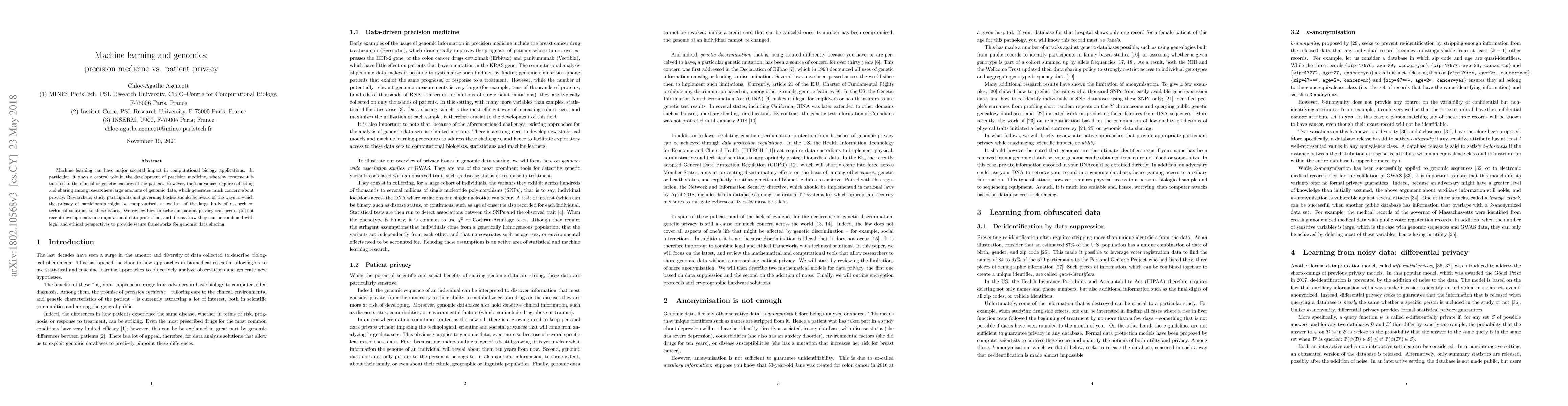 Machine learning can have major societal impact in computational biology applications. In particular, it plays a central role in the development of precision medicine, whereby treatment is tailored to the clinical or genetic features of the patient. However, these advances require collecting and sharing among researchers large amounts of genomic data, which generates much concern about privacy. Researchers, study participants and governing bodies should be aware of the ways in which the privacy of participants might be compromised, as well as of the large body of research on technical solutions to these issues. We review how breaches in patient privacy can occur, present recent developments in computational data protection, and discuss how they can be combined with legal and ethical perspectives to provide secure frameworks for genomic data sharing.