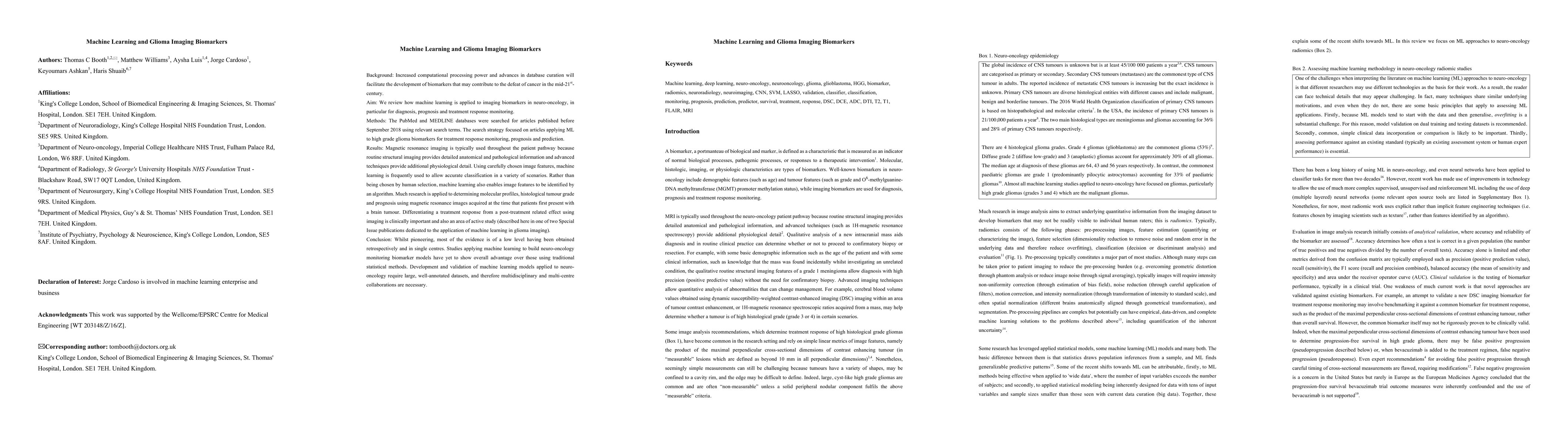 Aim: To review how machine learning (ML) is applied to imaging biomarkers in neuro-oncology, in particular for diagnosis, prognosis, and treatment response monitoring. Materials and Methods: The PubMed and MEDLINE databases were searched for articles published before September 2018 using relevant search terms. The search strategy focused on articles applying ML to high-grade glioma biomarkers for treatment response monitoring, prognosis, and prediction. Results: Magnetic resonance imaging (MRI) is typically used throughout the patient pathway because routine structural imaging provides detailed anatomical and pathological information and advanced techniques provide additional physiological detail. Using carefully chosen image features, ML is frequently used to allow accurate classification in a variety of scenarios. Rather than being chosen by human selection, ML also enables image features to be identified by an algorithm. Much research is applied to determining molecular profiles, histological tumour grade, and prognosis using MRI images acquired at the time that patients first present with a brain tumour. Differentiating a treatment response from a post-treatment-related effect using imaging is clinically important and also an area of active study (described here in one of two Special Issue publications dedicated to the application of ML in glioma imaging). Conclusion: Although pioneering, most of the evidence is of a low level, having been obtained retrospectively and in single centres. Studies applying ML to build neuro-oncology monitoring biomarker models have yet to show an overall advantage over those using traditional statistical methods. Development and validation of ML models applied to neuro-oncology require large, well-annotated datasets, and therefore multidisciplinary and multi-centre collaborations are necessary.