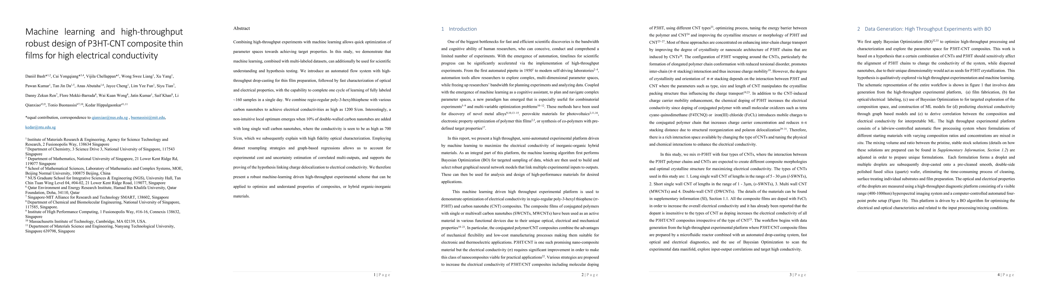 Combining high-throughput experiments with machine learning allows quick optimization of parameter spaces towards achieving target properties. In this study, we demonstrate that machine learning, combined with multi-labeled datasets, can additionally be used for scientific understanding and hypothesis testing. We introduce an automated flow system with high-throughput drop-casting for thin film preparation, followed by fast characterization of optical and electrical properties, with the capability to complete one cycle of learning of fully labeled ~160 samples in a single day. We combine regio-regular poly-3-hexylthiophene with various carbon nanotubes to achieve electrical conductivities as high as 1200 S/cm. Interestingly, a non-intuitive local optimum emerges when 10% of double-walled carbon nanotubes are added with long single wall carbon nanotubes, where the conductivity is seen to be as high as 700 S/cm, which we subsequently explain with high fidelity optical characterization. Employing dataset resampling strategies and graph-based regressions allows us to account for experimental cost and uncertainty estimation of correlated multi-outputs, and supports the proving of the hypothesis linking charge delocalization to electrical conductivity. We therefore present a robust machine-learning driven high-throughput experimental scheme that can be applied to optimize and understand properties of composites, or hybrid organic-inorganic materials.
