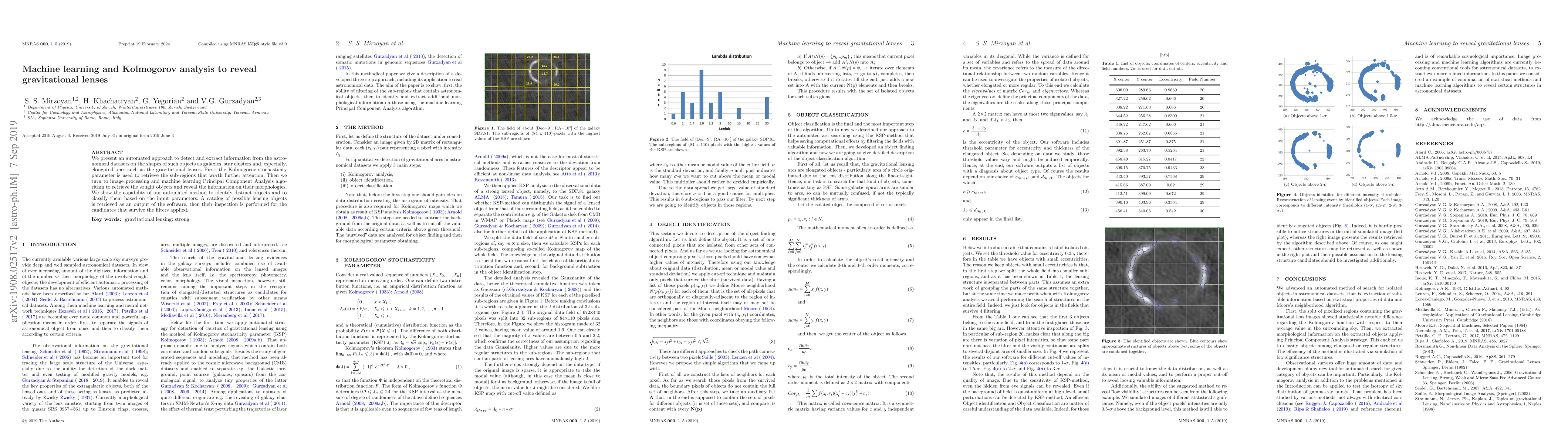 This paper introduces an automated machine learning method combining Kolmogorov analysis and Principal Component Analysis to detect and classify gravitational lenses from astronomical datasets. The approach identifies and extracts morphological information from galaxies and star clusters, ultimately generating a catalog of potential lensing objects.