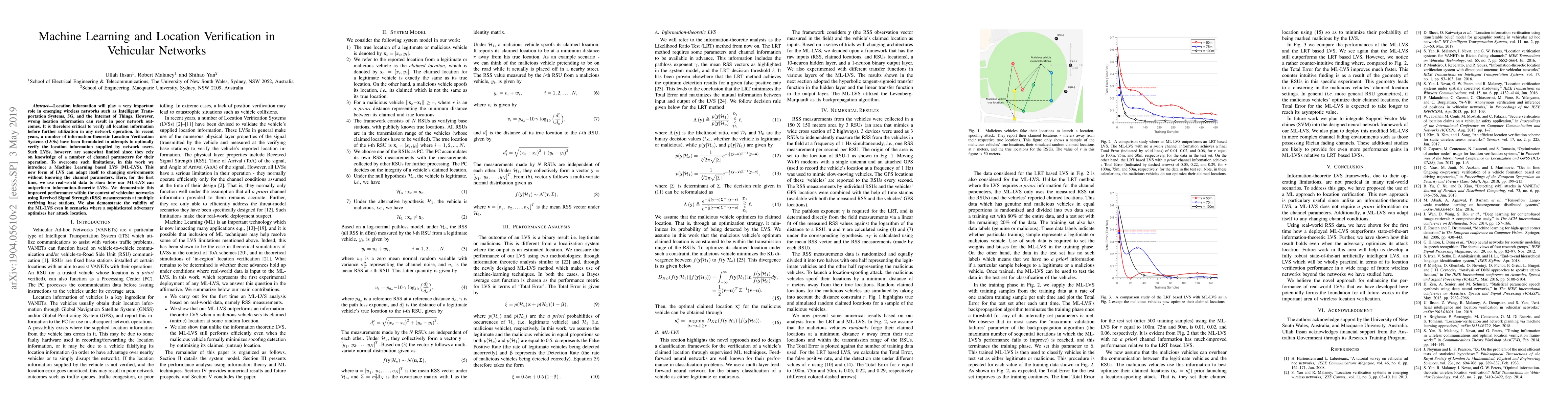 This paper introduces a Machine Learning based Location Verification System (ML-LVS) for vehicular networks, which outperforms traditional information-theoretic LVSs by adapting to changing environments without requiring channel parameter knowledge. The ML-LVS demonstrates superior performance using real-world data and RSS measurements, even against sophisticated adversarial attacks.
