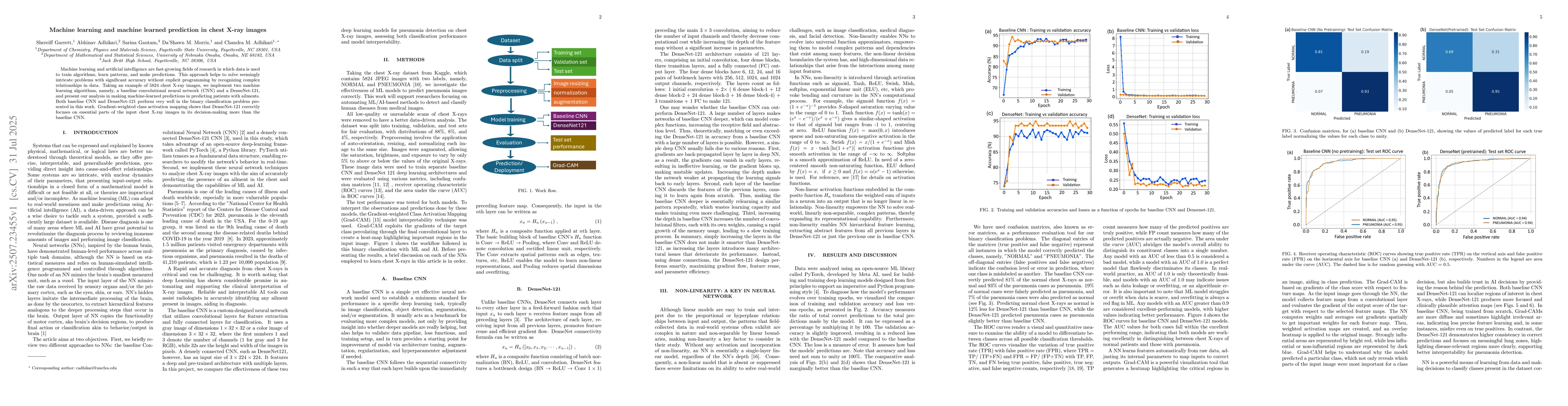 Machine learning and artificial intelligence are fast-growing fields of research in which data is used to train algorithms, learn patterns, and make predictions. This approach helps to solve seemingly intricate problems with significant accuracy without explicit programming by recognizing complex relationships in data. Taking an example of 5824 chest X-ray images, we implement two machine learning algorithms, namely, a baseline convolutional neural network (CNN) and a DenseNet-121, and present our analysis in making machine-learned predictions in predicting patients with ailments. Both baseline CNN and DenseNet-121 perform very well in the binary classification problem presented in this work. Gradient-weighted class activation mapping shows that DenseNet-121 correctly focuses on essential parts of the input chest X-ray images in its decision-making more than the baseline CNN.
