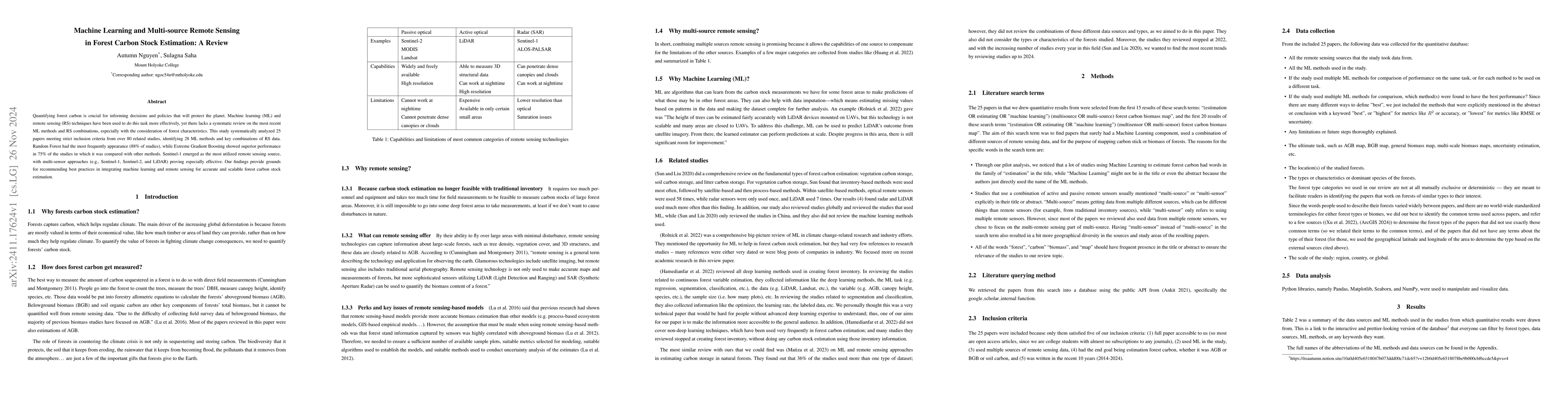 This review analyzes 25 papers to identify the most effective machine learning methods and remote sensing combinations for estimating forest carbon stocks, with Random Forest and multi-sensor approaches like Sentinel-1 and Sentinel-2 proving most successful.