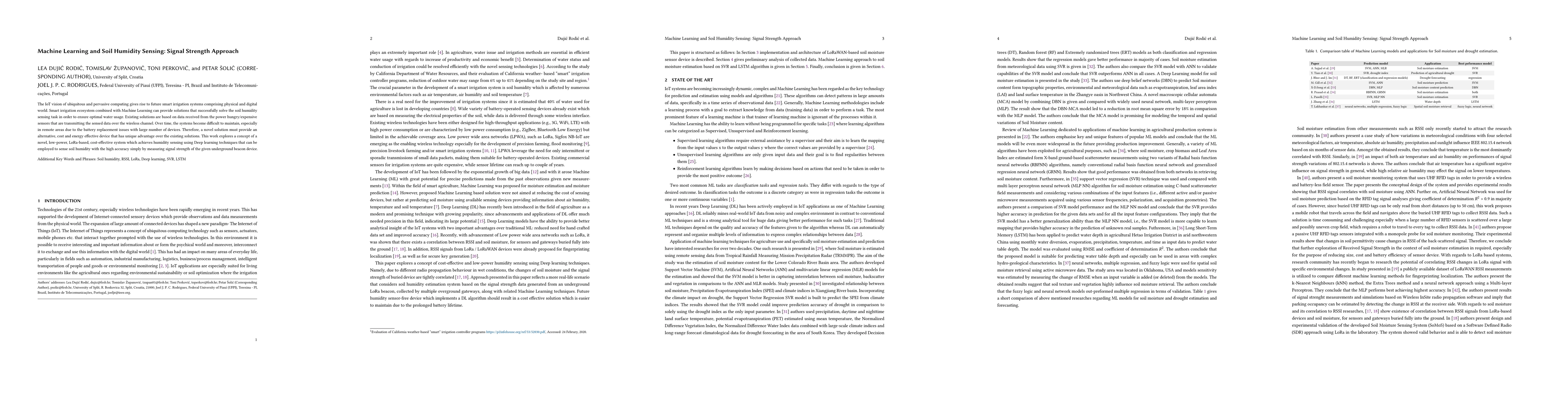 The IoT vision of ubiquitous and pervasive computing gives rise to future smart irrigation systems comprising physical and digital world. Smart irrigation ecosystem combined with Machine Learning can provide solutions that successfully solve the soil humidity sensing task in order to ensure optimal water usage. Existing solutions are based on data received from the power hungry/expensive sensors that are transmitting the sensed data over the wireless channel. Over time, the systems become difficult to maintain, especially in remote areas due to the battery replacement issues with large number of devices. Therefore, a novel solution must provide an alternative, cost and energy effective device that has unique advantage over the existing solutions. This work explores a concept of a novel, low-power, LoRa-based, cost-effective system which achieves humidity sensing using Deep learning techniques that can be employed to sense soil humidity with the high accuracy simply by measuring signal strength of the given underground beacon device.