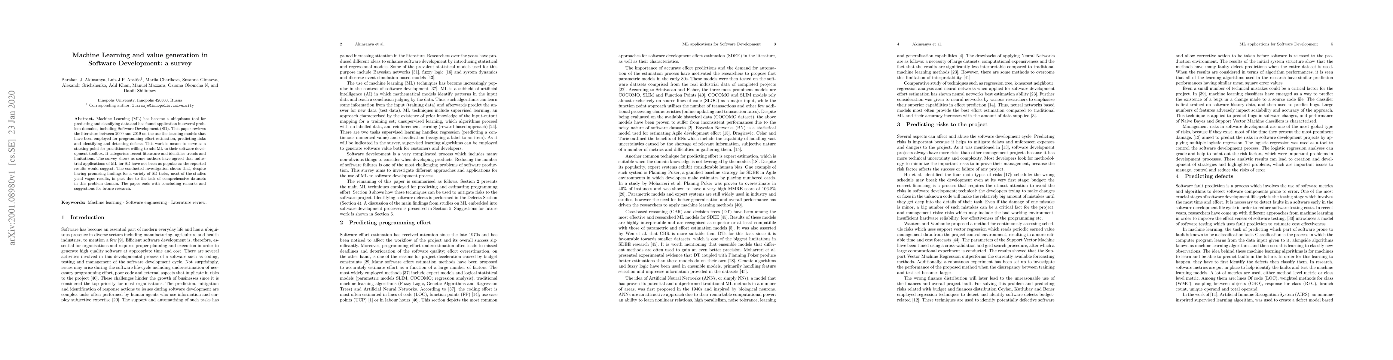 Machine Learning (ML) has become a ubiquitous tool for predicting and classifying data and has found application in several problem domains, including Software Development (SD). This paper reviews the literature between 2000 and 2019 on the use the learning models that have been employed for programming effort estimation, predicting risks and identifying and detecting defects. This work is meant to serve as a starting point for practitioners willing to add ML to their software development toolbox. It categorises recent literature and identifies trends and limitations. The survey shows as some authors have agreed that industrial applications of ML for SD have not been as popular as the reported results would suggest. The conducted investigation shows that, despite having promising findings for a variety of SD tasks, most of the studies yield vague results, in part due to the lack of comprehensive datasets in this problem domain. The paper ends with concluding remarks and suggestions for future research.