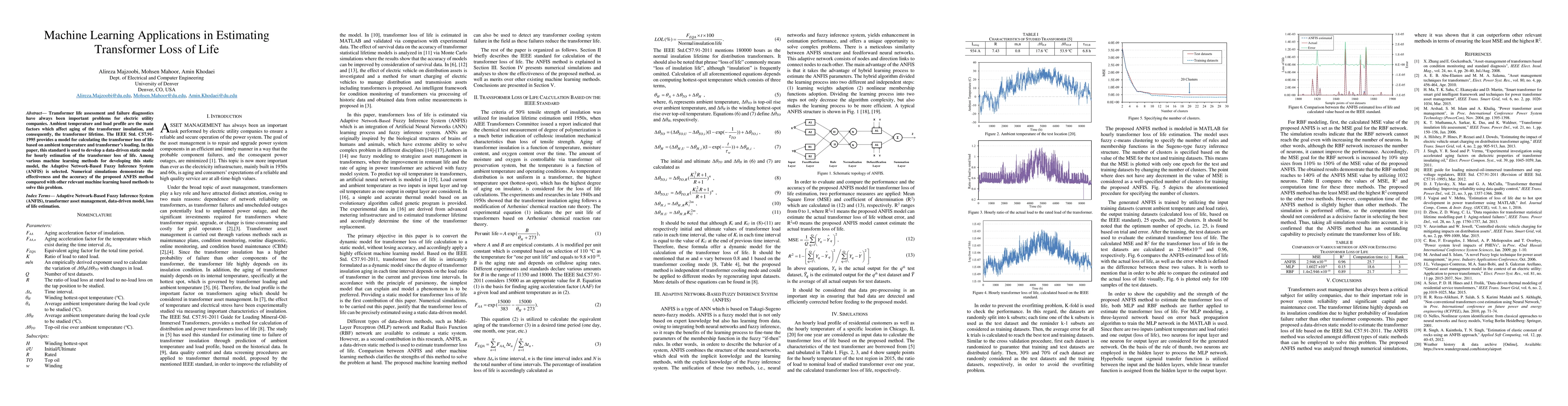 Transformer life assessment and failure diagnostics have always been important problems for electric utility companies. Ambient temperature and load profile are the main factors which affect aging of the transformer insulation, and consequently, the transformer lifetime. The IEEE Std. C57.911995 provides a model for calculating the transformer loss of life based on ambient temperature and transformer's loading. In this paper, this standard is used to develop a data-driven static model for hourly estimation of the transformer loss of life. Among various machine learning methods for developing this static model, the Adaptive Network-Based Fuzzy Inference System (ANFIS) is selected. Numerical simulations demonstrate the effectiveness and the accuracy of the proposed ANFIS method compared with other relevant machine learning based methods to solve this problem.