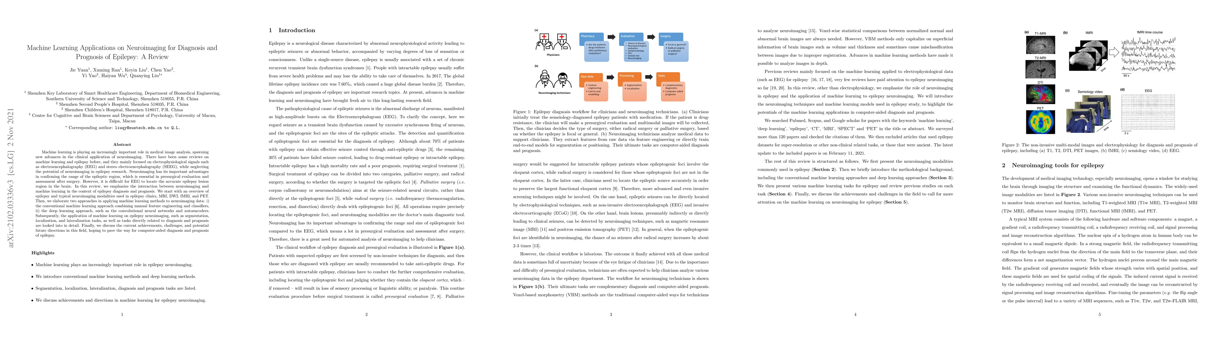 This review explores the integration of machine learning with neuroimaging for diagnosing and predicting epilepsy, highlighting the advantages of neuroimaging over EEG. It covers conventional and deep learning methods applied to MRI, DWI, fMRI, and PET data, and discusses their use in segmentation, localization, and prognosis, while identifying challenges and future directions.