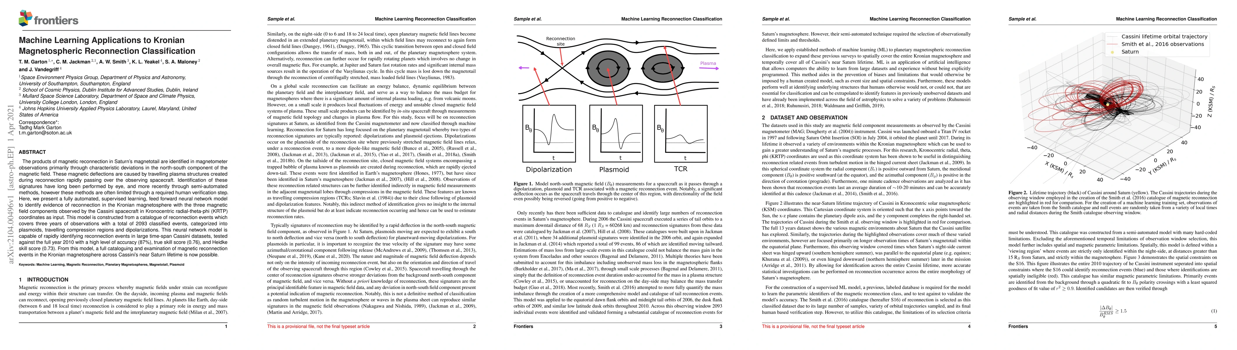 The products of magnetic reconnection in Saturn's magnetotail are identified in magnetometer observations primarily through characteristic deviations in the north-south component of the magnetic field. These magnetic deflections are caused by travelling plasma structures created during reconnection rapidly passing over the observing spacecraft. Identification of these signatures have long been performed by eye, and more recently through semi-automated methods, however these methods are often limited through a required human verification step. Here, we present a fully automated, supervised learning, feed forward neural network model to identify evidence of reconnection in the Kronian magnetosphere with the three magnetic field components observed by the Cassini spacecraft in Kronocentric radial-theta-phi (KRTP) coordinates as input. This model is constructed from a catalogue of reconnection events which covers three years of observations with a total of 2093 classified events, categorized into plasmoids, travelling compression regions and dipolarizations. This neural network model is capable of rapidly identifying reconnection events in large time-span Cassini datasets, tested against the full year 2010 with a high level of accuracy (87%), true skill score (0.76), and Heidke skill score (0.73). From this model, a full cataloguing and examination of magnetic reconnection events in the Kronian magnetosphere across Cassini's near Saturn lifetime is now possible.