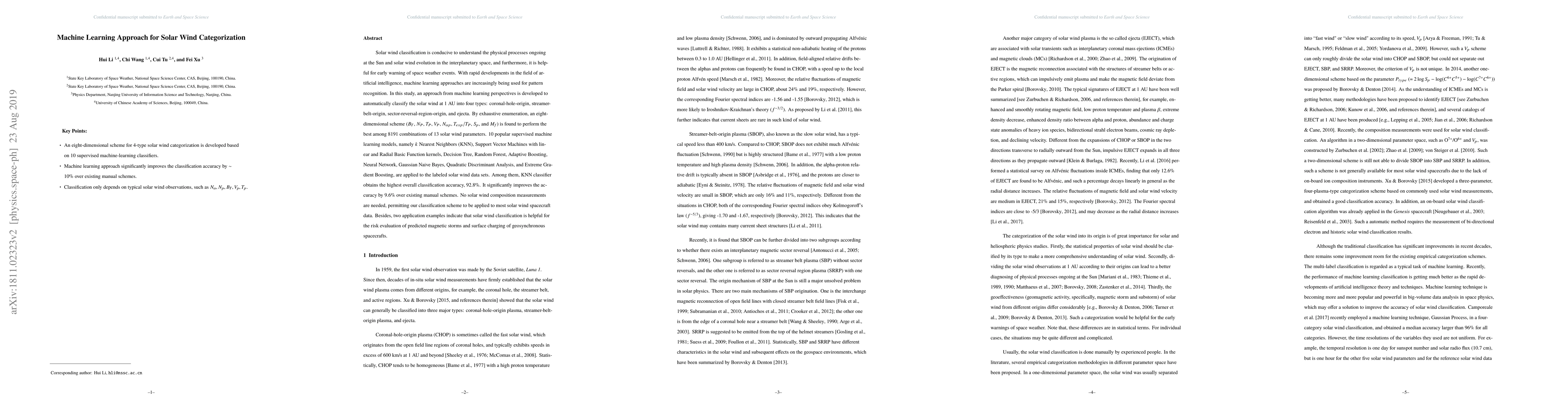 This study develops a machine learning approach to classify solar wind into four types at 1 AU, improving accuracy by 9.6% over existing manual schemes.