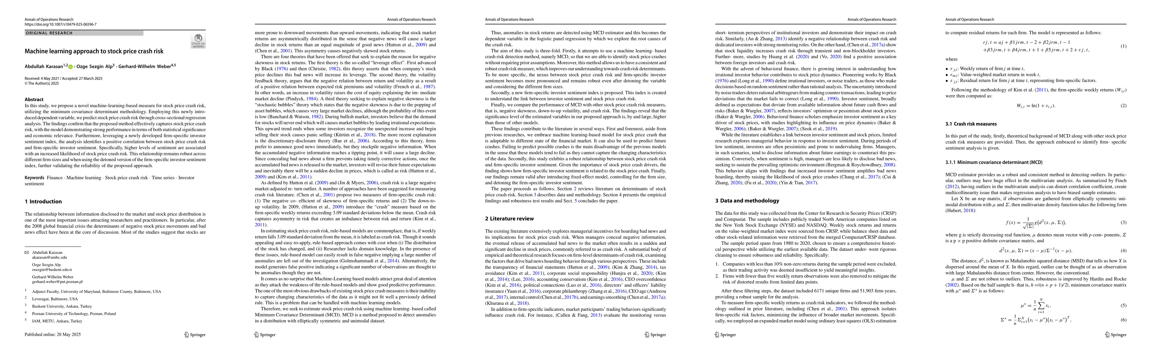 The research proposes a machine-learning-based measure for stock price crash risk using the minimum covariance determinant methodology. It employs cross-sectional regression analysis to predict crash risk with the newly introduced dependent variable.