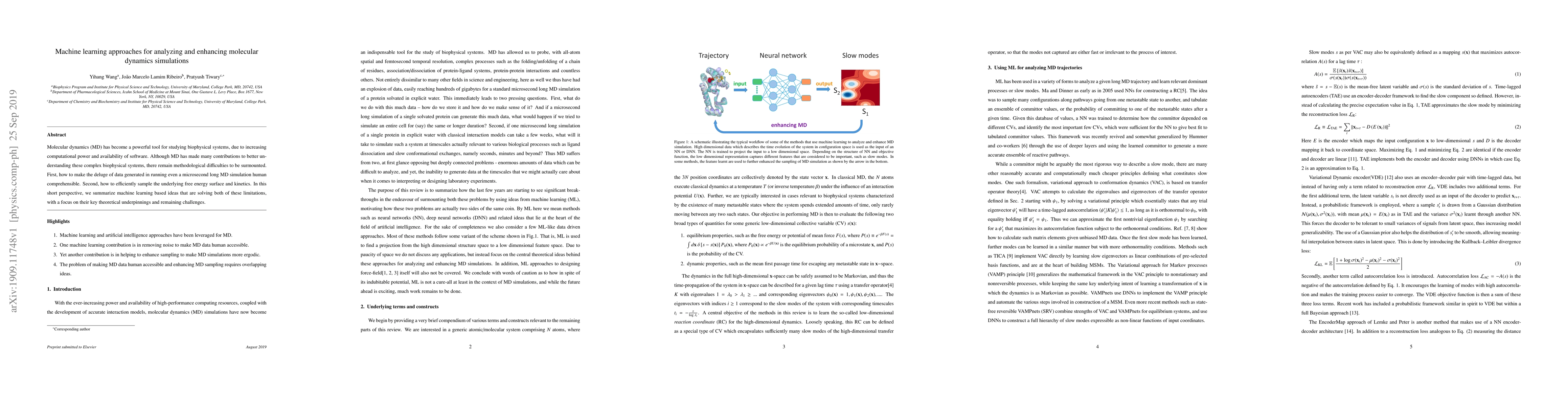 Molecular dynamics (MD) has become a powerful tool for studying biophysical systems, due to increasing computational power and availability of software. Although MD has made many contributions to better understanding these complex biophysical systems, there remain methodological difficulties to be surmounted. First, how to make the deluge of data generated in running even a microsecond long MD simulation human comprehensible. Second, how to efficiently sample the underlying free energy surface and kinetics. In this short perspective, we summarize machine learning based ideas that are solving both of these limitations, with a focus on their key theoretical underpinnings and remaining challenges.