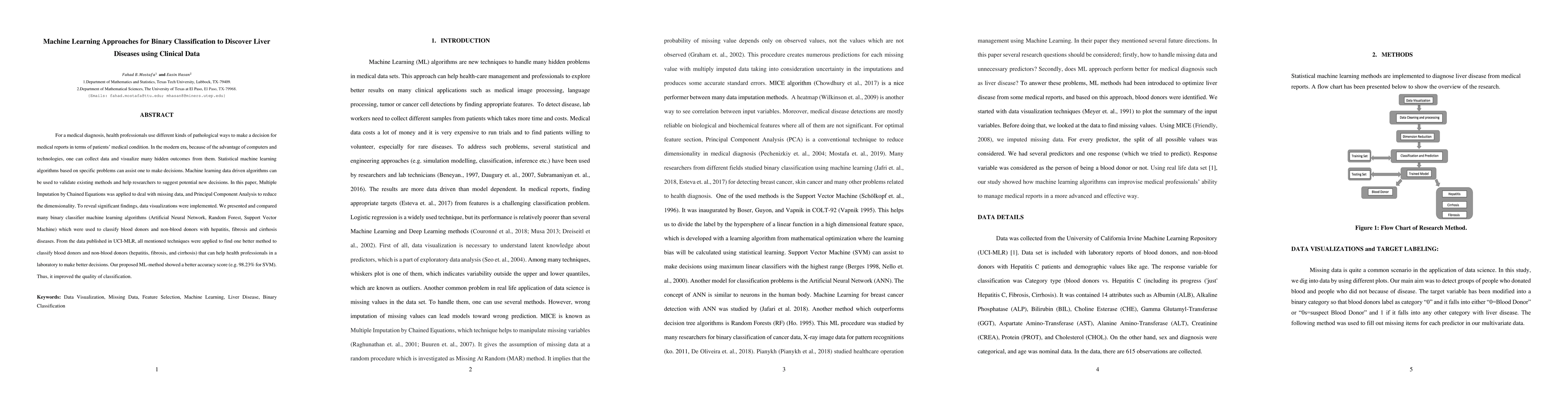 This research compares machine learning algorithms (ANN, Random Forest, SVM) to classify blood donors with hepatitis, fibrosis, or cirrhosis using clinical data. The study employed multiple imputation and PCA to handle missing data and dimensionality, achieving high accuracy (98.23% with SVM), potentially aiding health professionals in more accurate diagnoses.