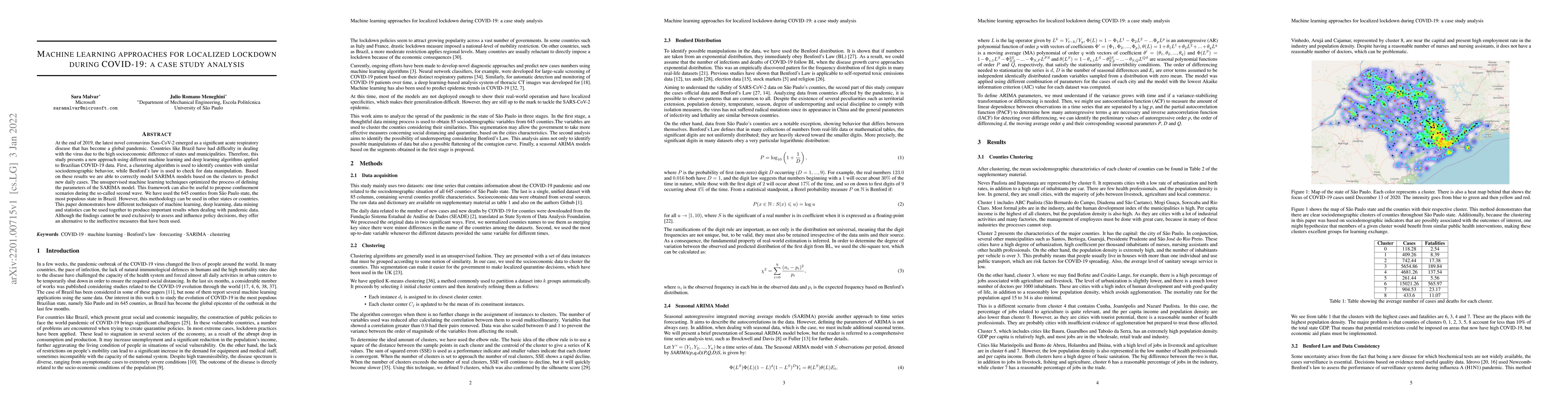 At the end of 2019, the latest novel coronavirus Sars-CoV-2 emerged as a significant acute respiratory disease that has become a global pandemic. Countries like Brazil have had difficulty in dealing with the virus due to the high socioeconomic difference of states and municipalities. Therefore, this study presents a new approach using different machine learning and deep learning algorithms applied to Brazilian COVID-19 data. First, a clustering algorithm is used to identify counties with similar sociodemographic behavior, while Benford's law is used to check for data manipulation. Based on these results we are able to correctly model SARIMA models based on the clusters to predict new daily cases. The unsupervised machine learning techniques optimized the process of defining the parameters of the SARIMA model. This framework can also be useful to propose confinement scenarios during the so-called second wave. We have used the 645 counties from S\~ao Paulo state, the most populous state in Brazil. However, this methodology can be used in other states or countries. This paper demonstrates how different techniques of machine learning, deep learning, data mining and statistics can be used together to produce important results when dealing with pandemic data. Although the findings cannot be used exclusively to assess and influence policy decisions, they offer an alternative to the ineffective measures that have been used.